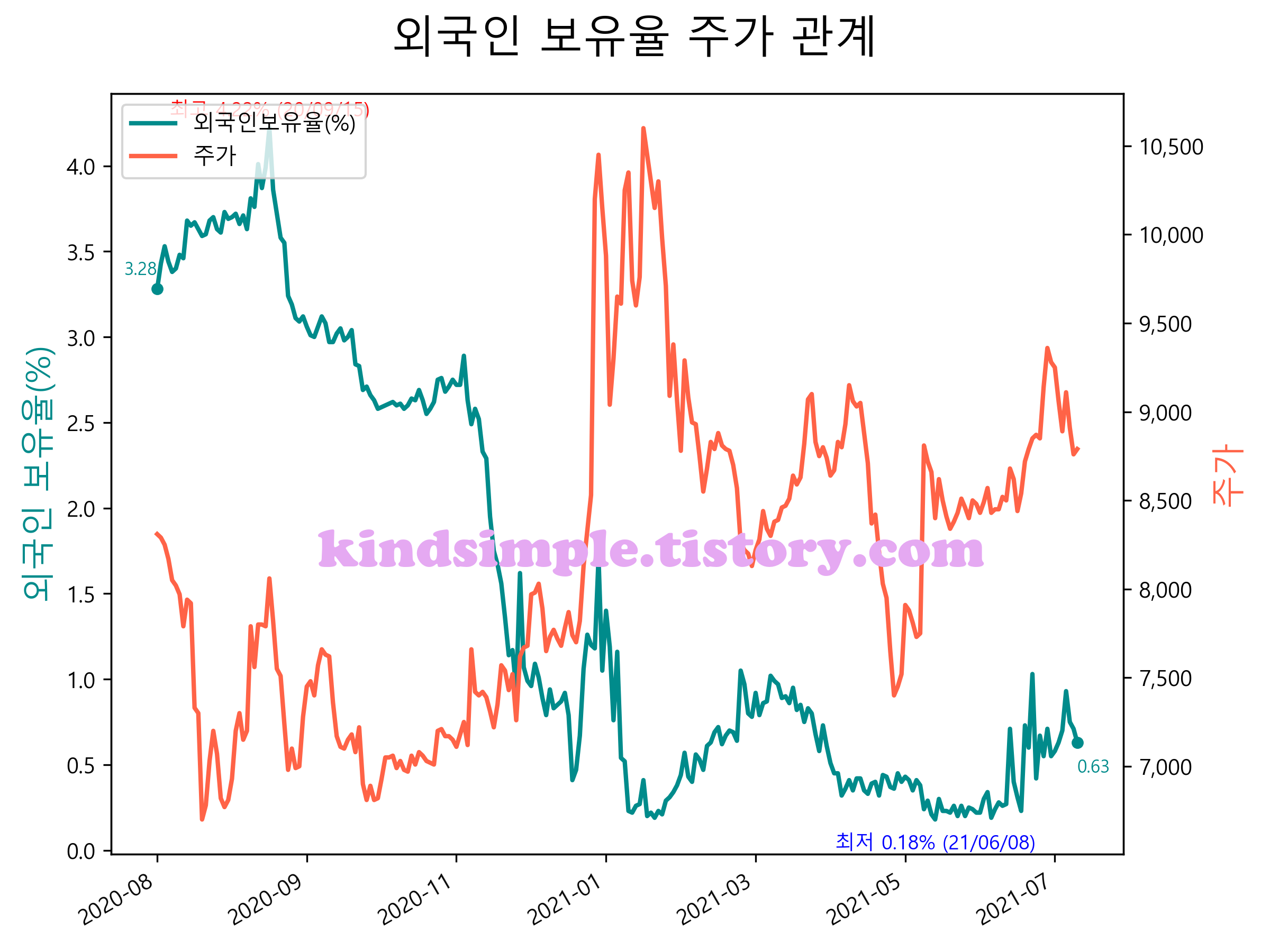 최근 1년간 외국인 보유율 및 주가와의 관계입니다.