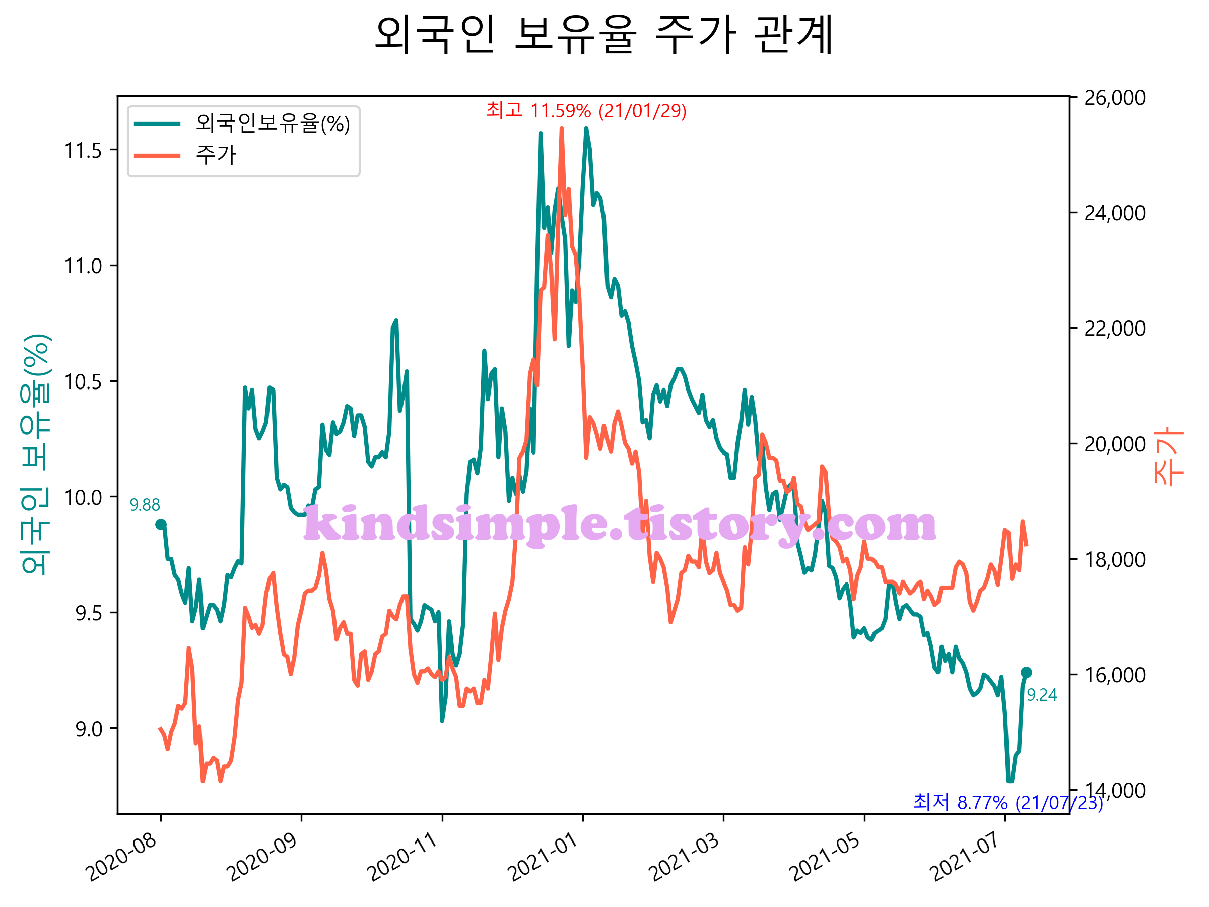 최근 1년간 외국인 보유율 및 주가와의 관계입니다.