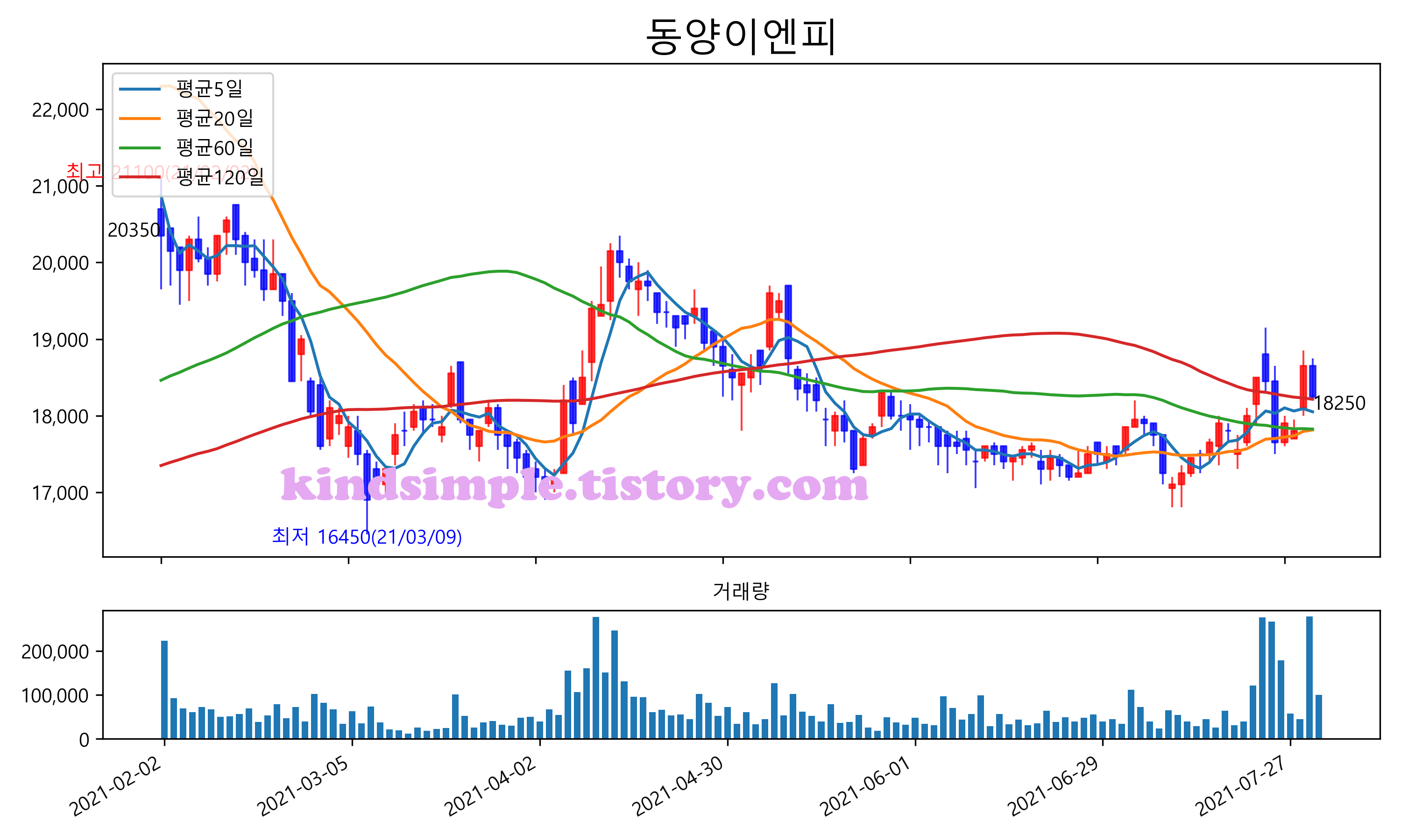 최근 6개월간 캔들차트 및 이동평균선입니다.