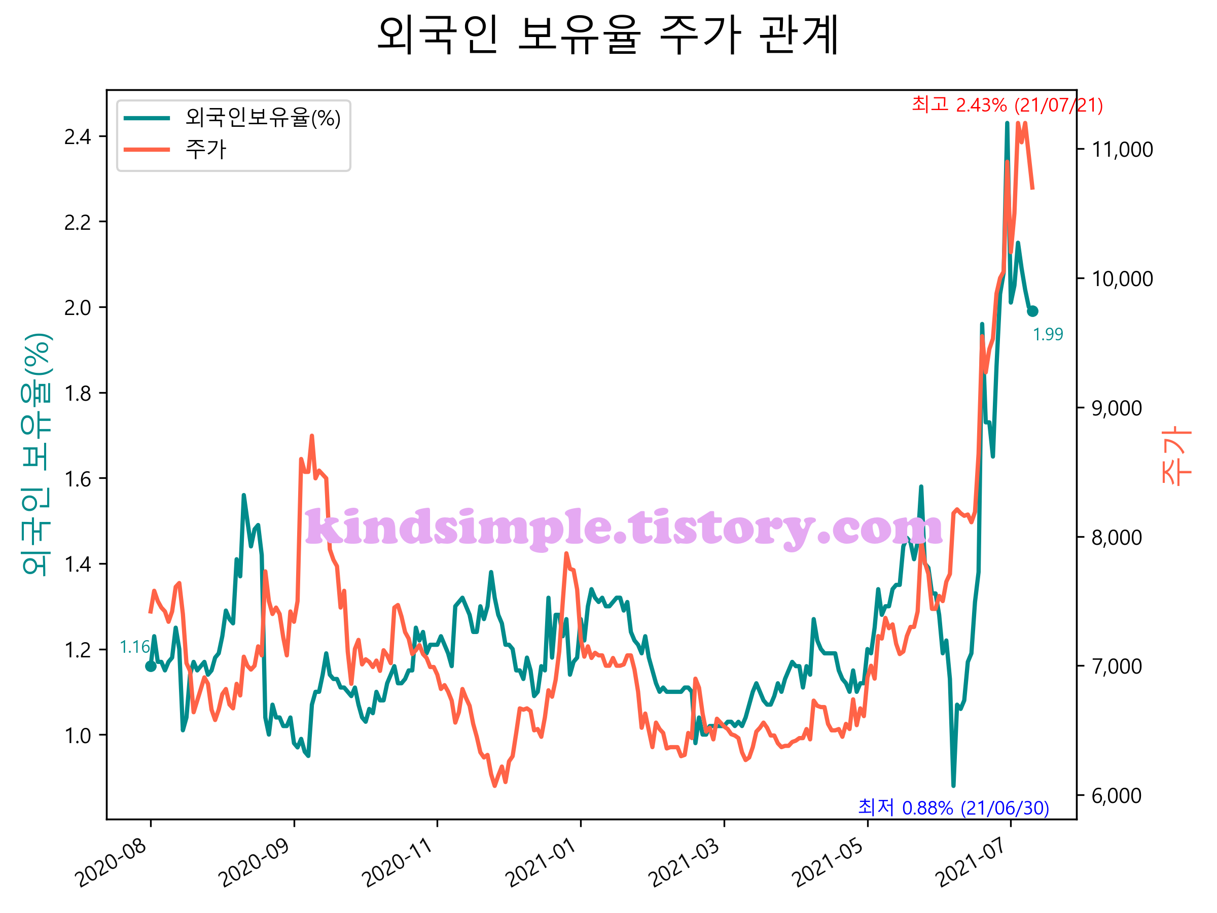 최근 1년간 외국인 보유율 및 주가와의 관계입니다.