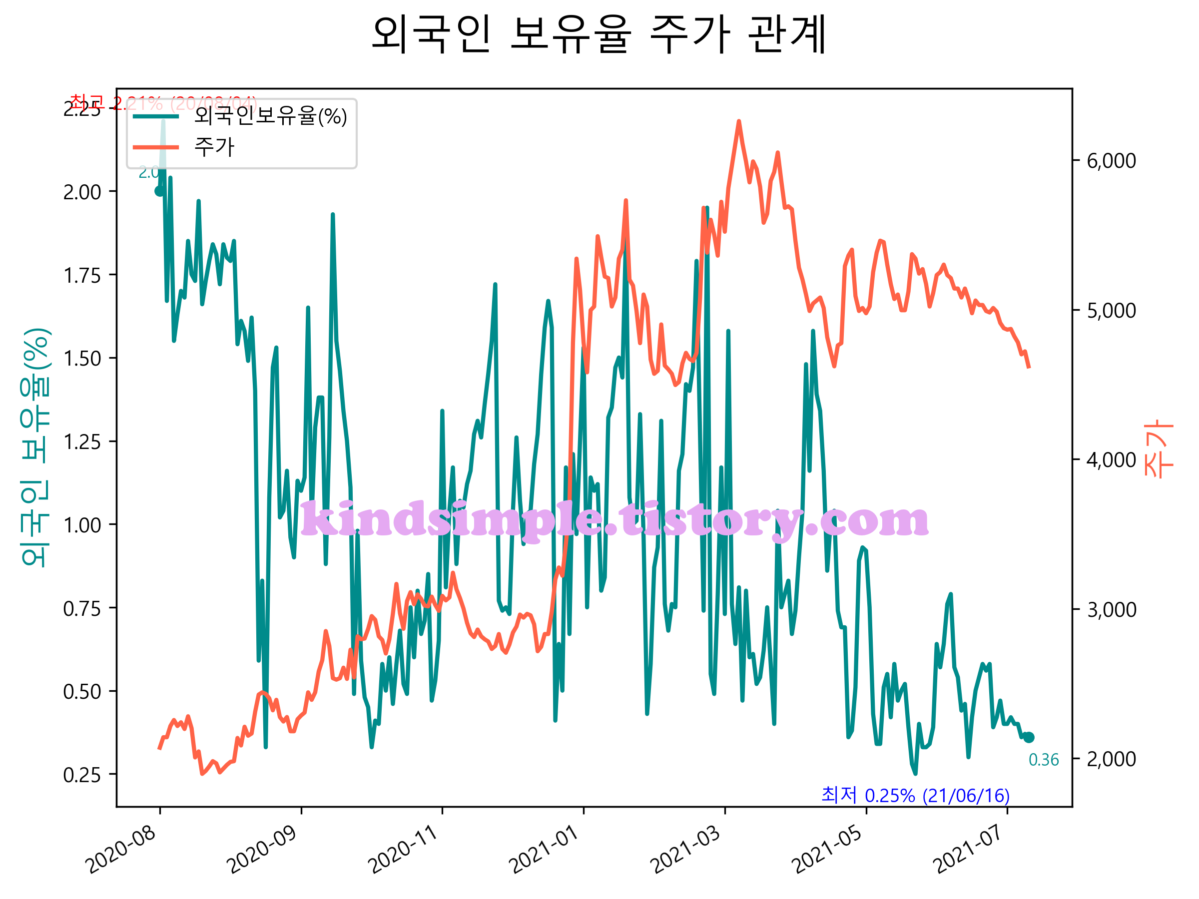 최근 1년간 외국인 보유율 및 주가와의 관계입니다.