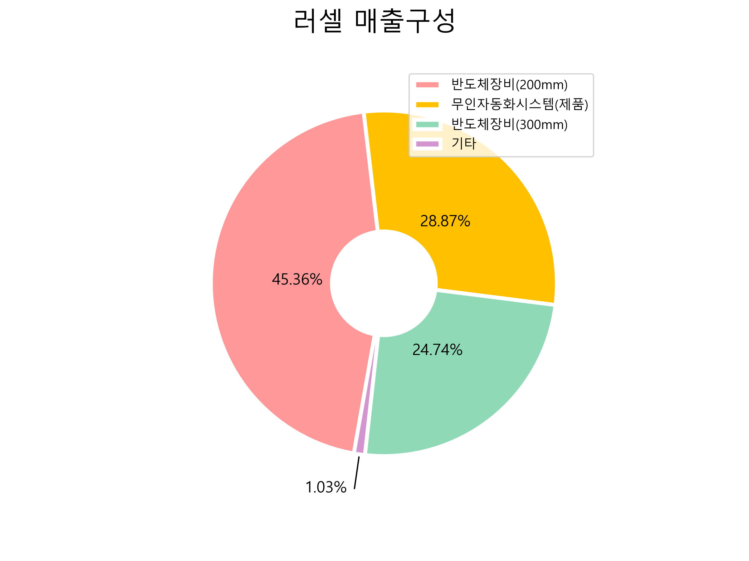 - 매출구성은 200mm 장비 44.9%, 300mm 장비 24.8%, 무인자동화시스템(제품) 28.24%, FA 0.21%, 무인자동화시스템 0.17%로 이루어져 있음.