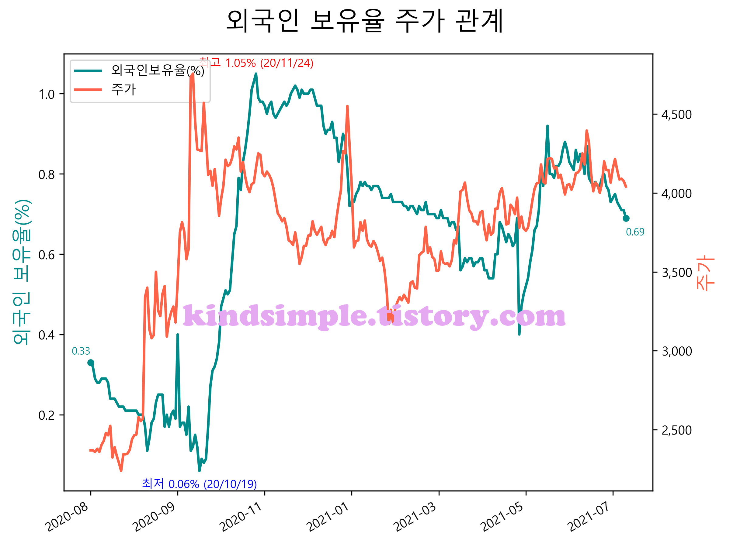 최근 1년간 외국인 보유율 및 주가와의 관계입니다.
