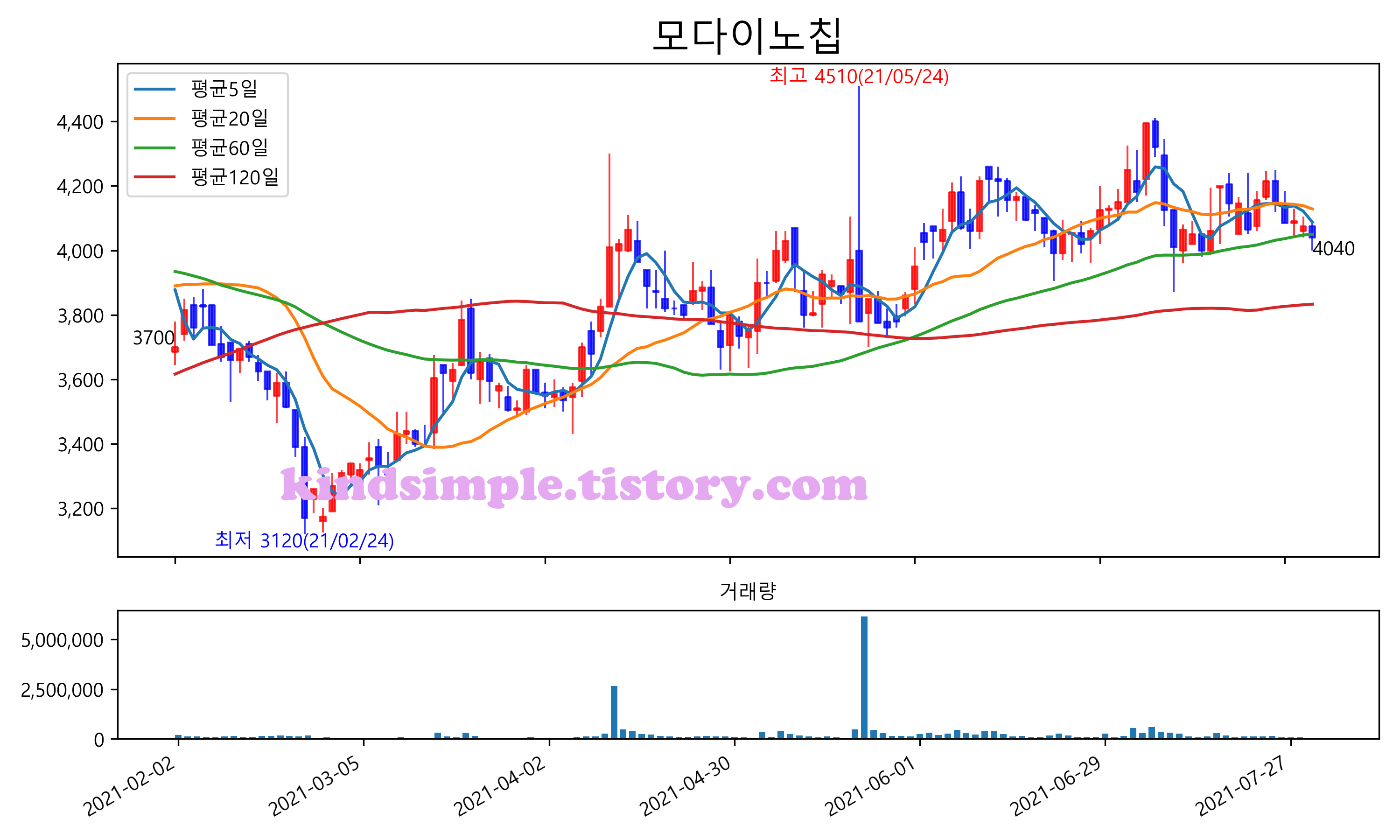 최근 6개월간 캔들차트 및 이동평균선입니다.