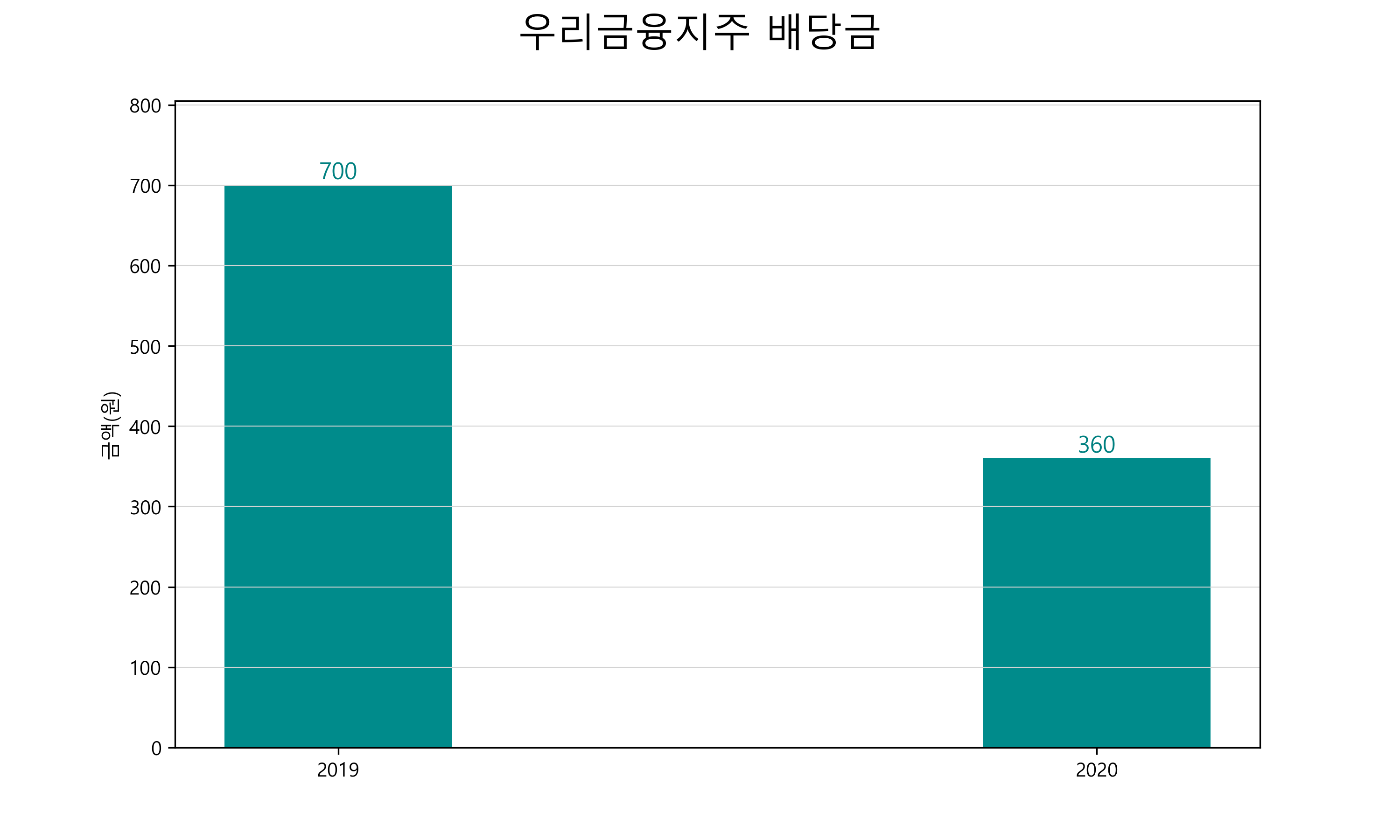 2020년 배당금은 주당 360원 입니다. 작년 배당금인 700원보다 -48.6% 감소했습니다. 우리금융지주는 2019년 2월 코스피에 상장했으며, 2019년에 역시 첫 배당을 실시했습니다.