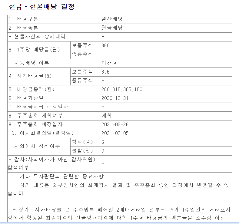 보통주는 360원이 배당되며, 시가배당율은 3.6% 입니다. 배당금 총액은 2,606억원 규모입니다.