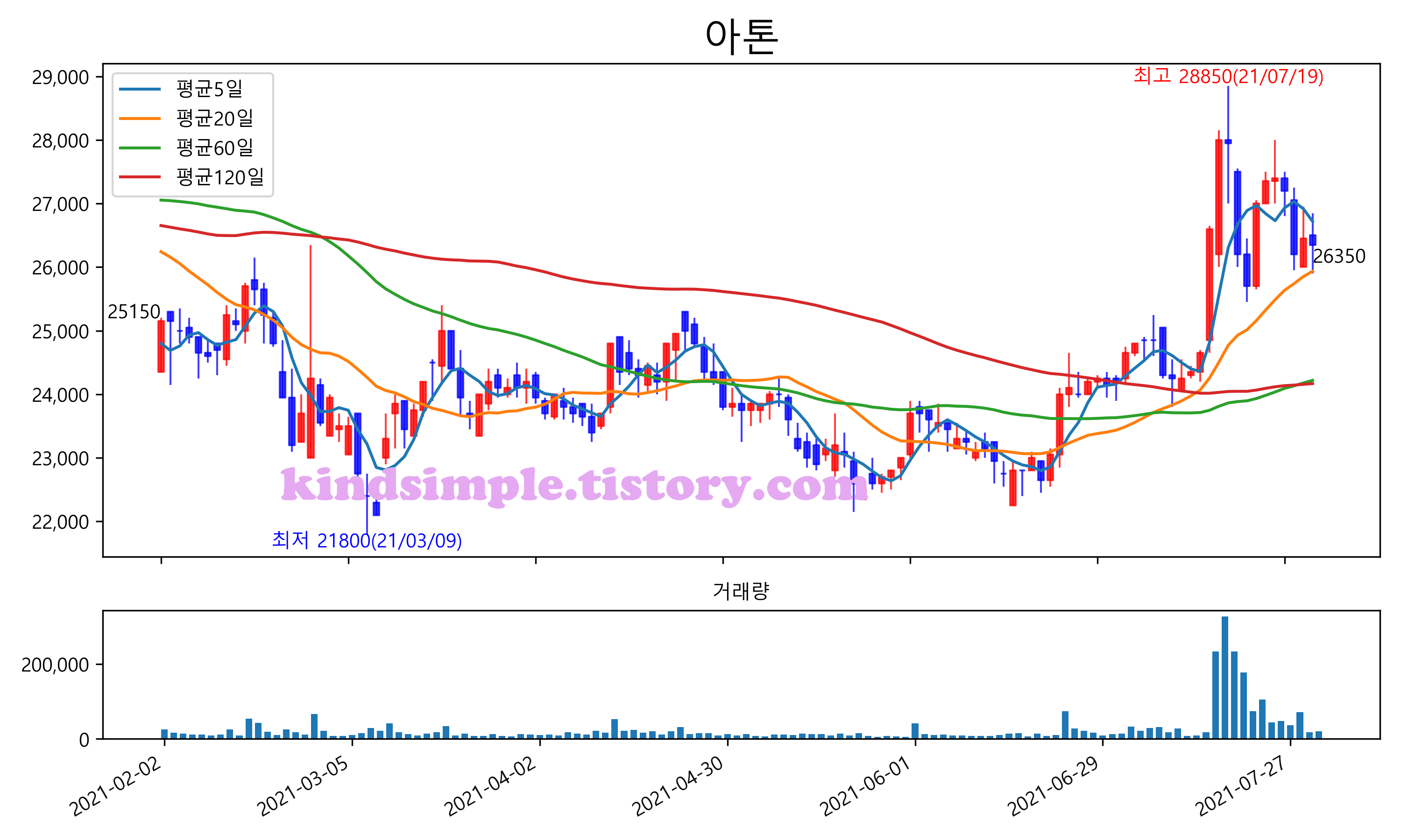 최근 6개월간 캔들차트 및 이동평균선입니다.
