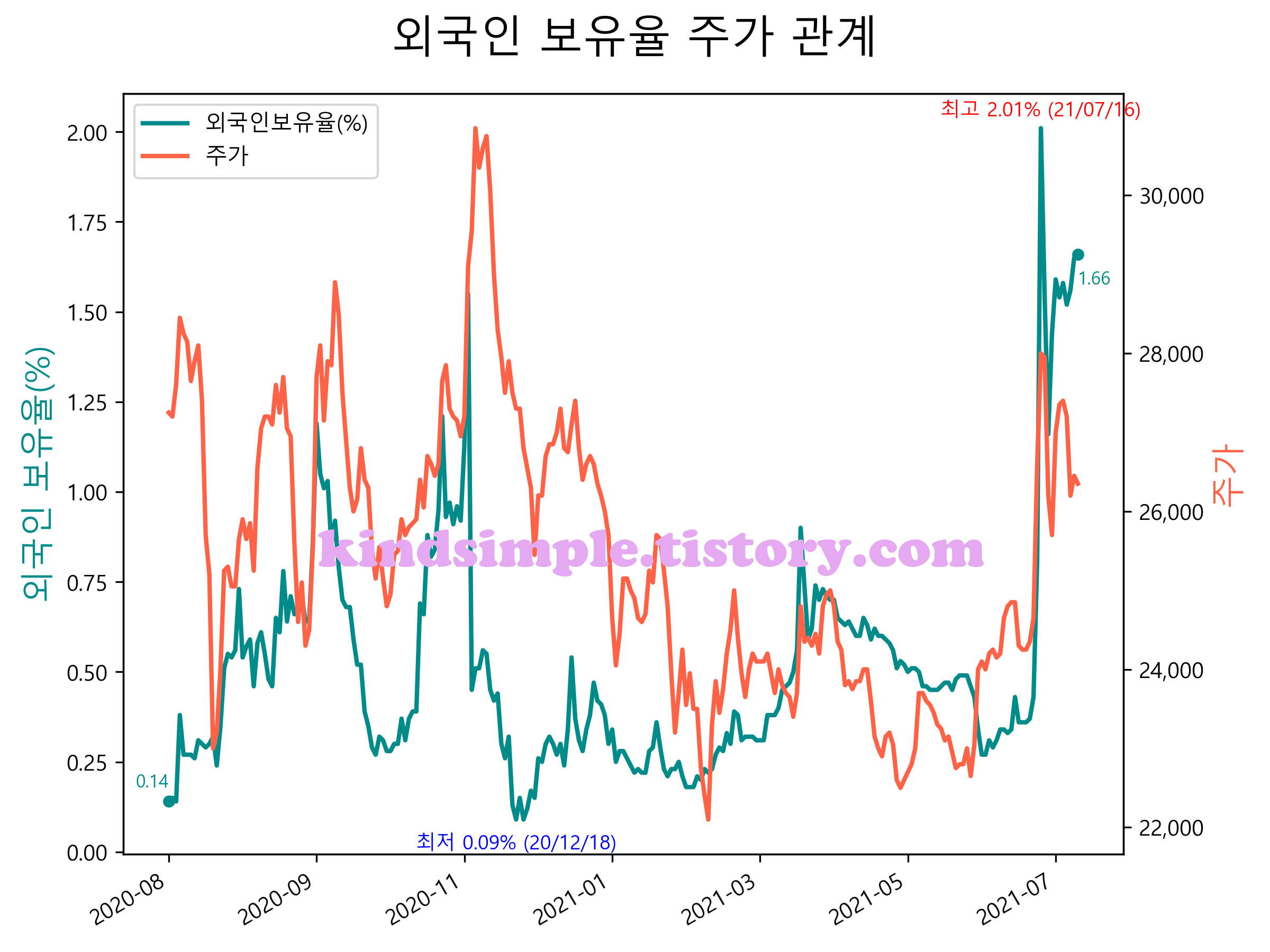 최근 1년간 외국인 보유율 및 주가와의 관계입니다.