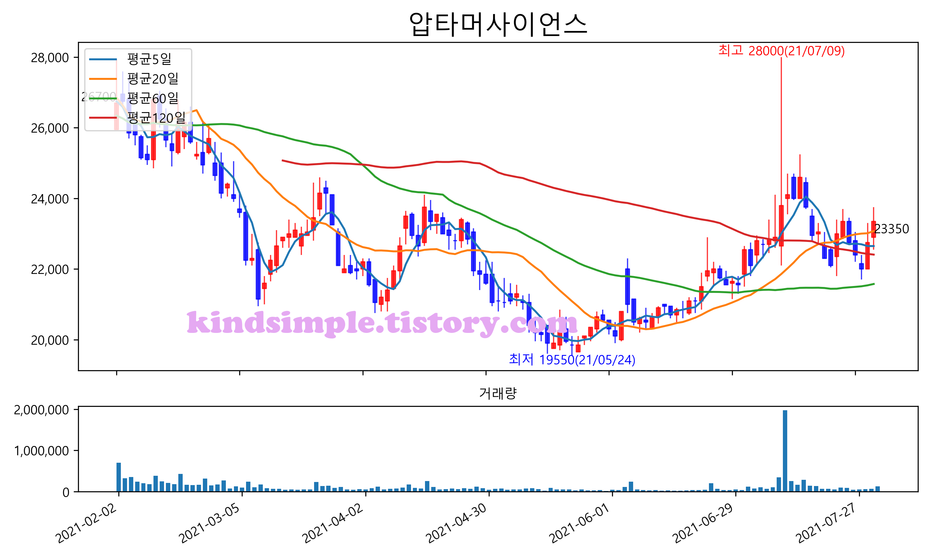 최근 6개월간 캔들차트 및 이동평균선입니다.