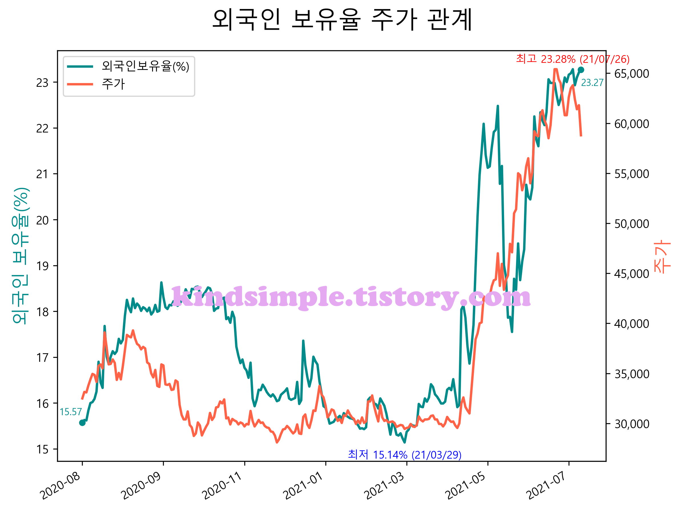 최근 1년간 외국인 보유율 및 주가와의 관계입니다.