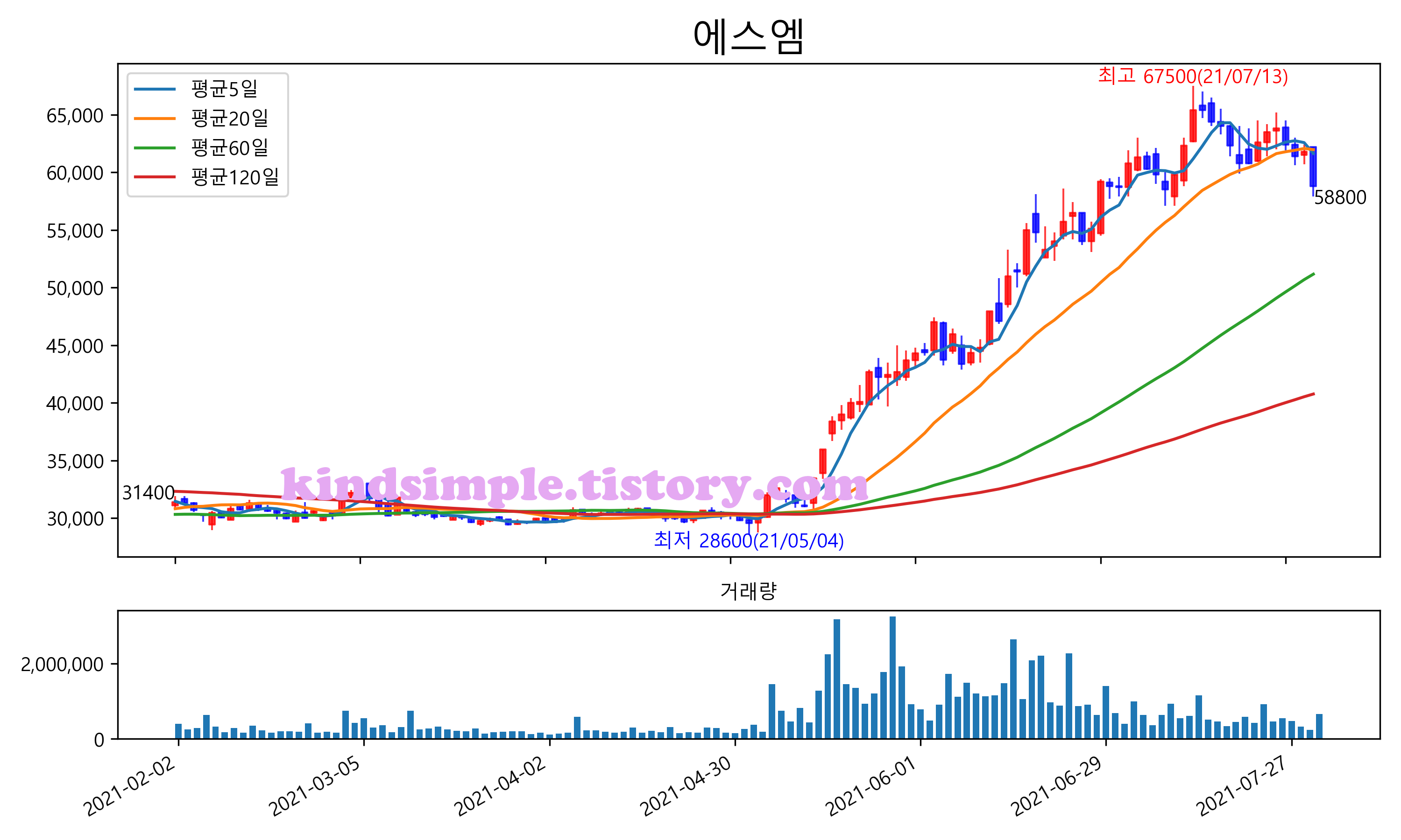 최근 6개월간 캔들차트 및 이동평균선입니다.