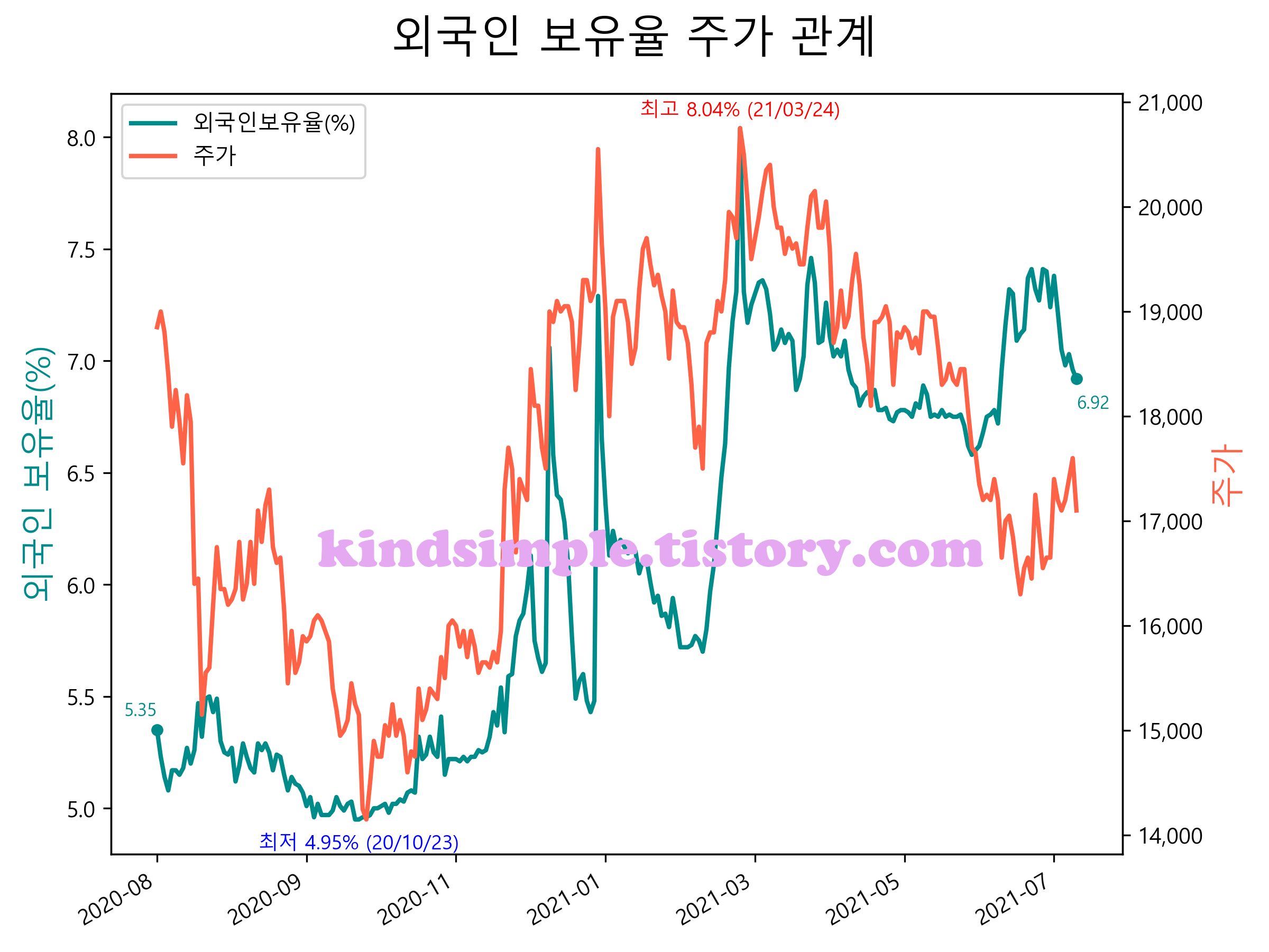최근 1년간 외국인 보유율 및 주가와의 관계입니다.