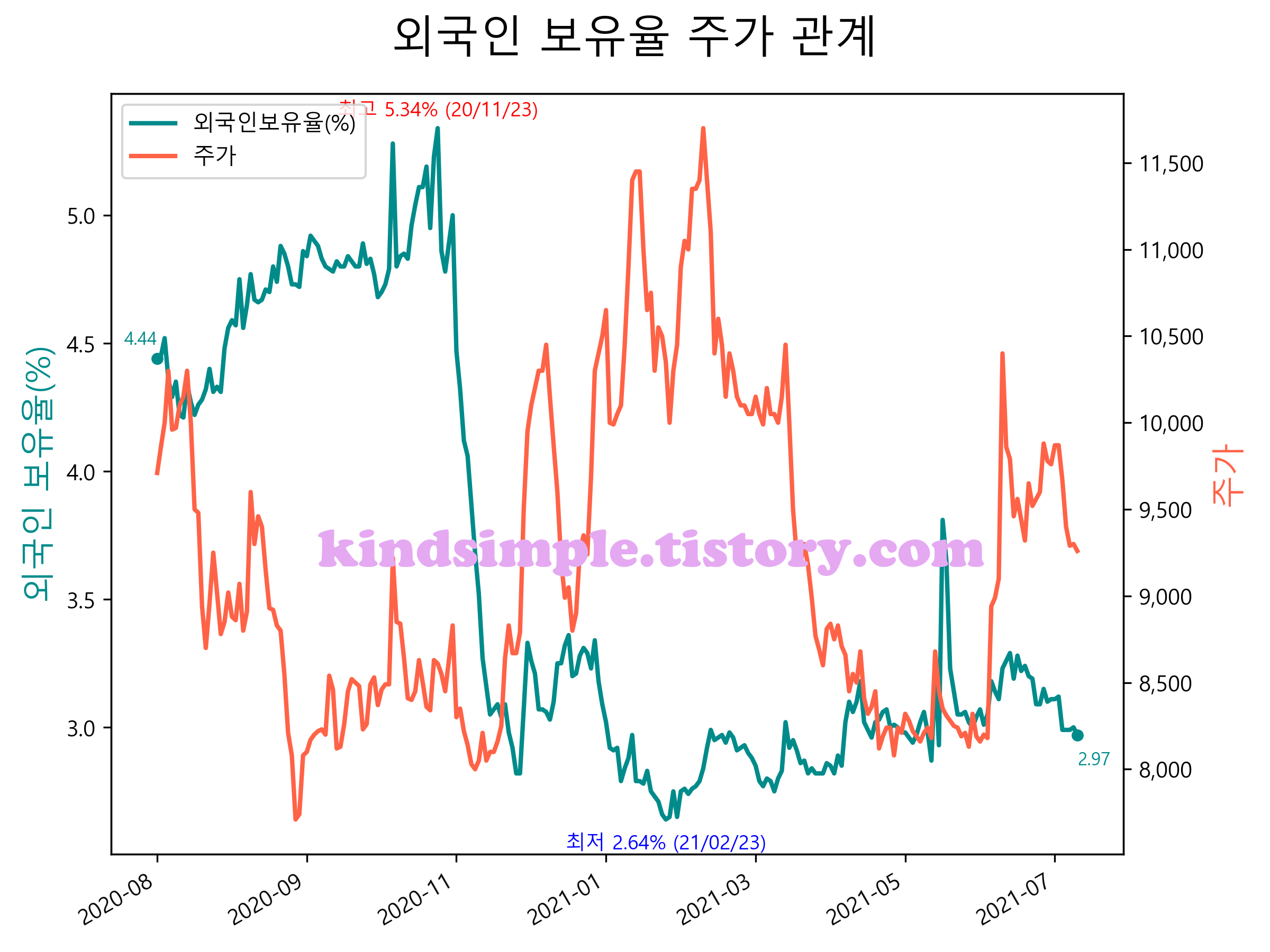 최근 1년간 외국인 보유율 및 주가와의 관계입니다.