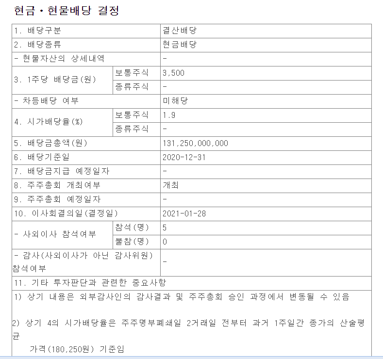 2020년 배당금은 주당 3,500원 입니다. 작년 배당금과 동일합니다.