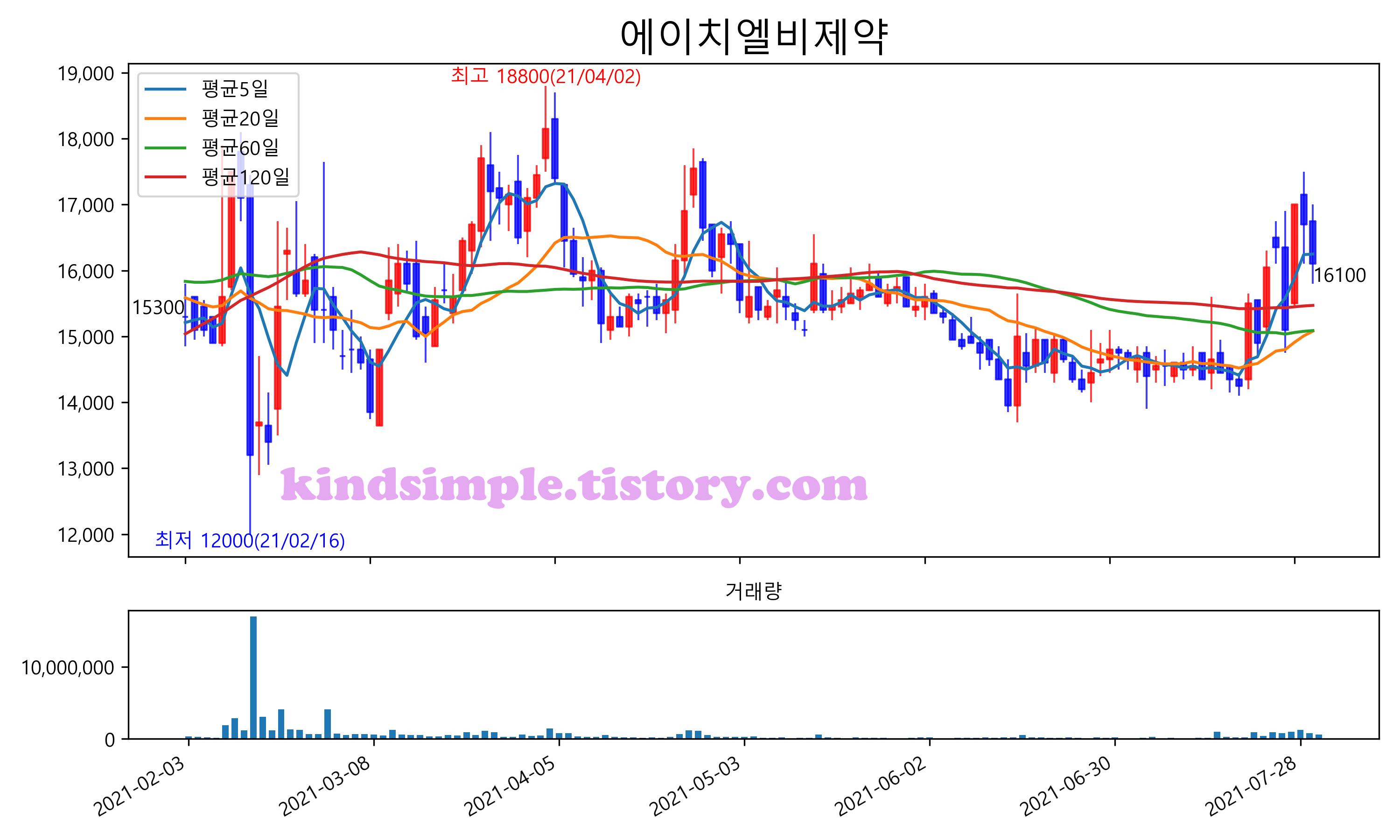 최근 6개월간 캔들차트 및 이동평균선입니다.
