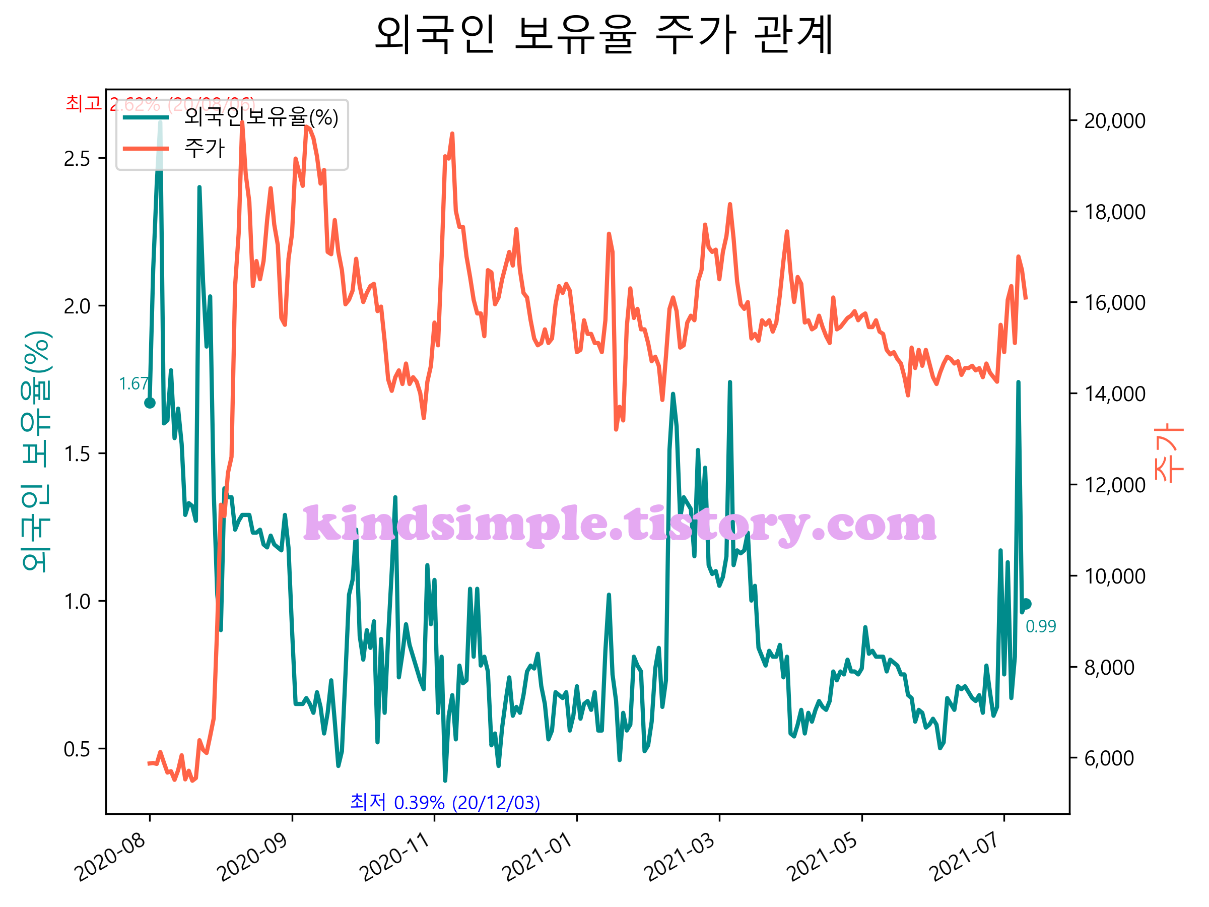 최근 1년간 외국인 보유율 및 주가와의 관계입니다.