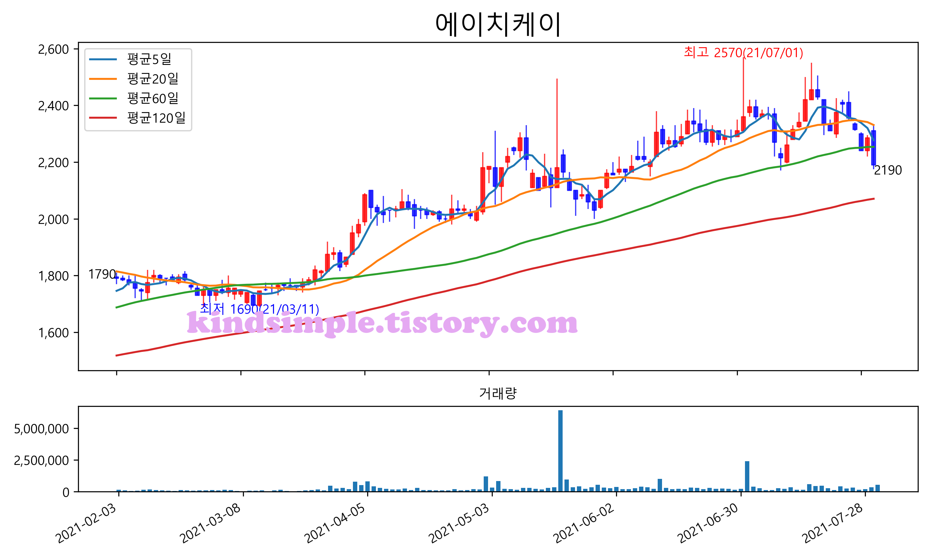 최근 6개월간 캔들차트 및 이동평균선입니다.