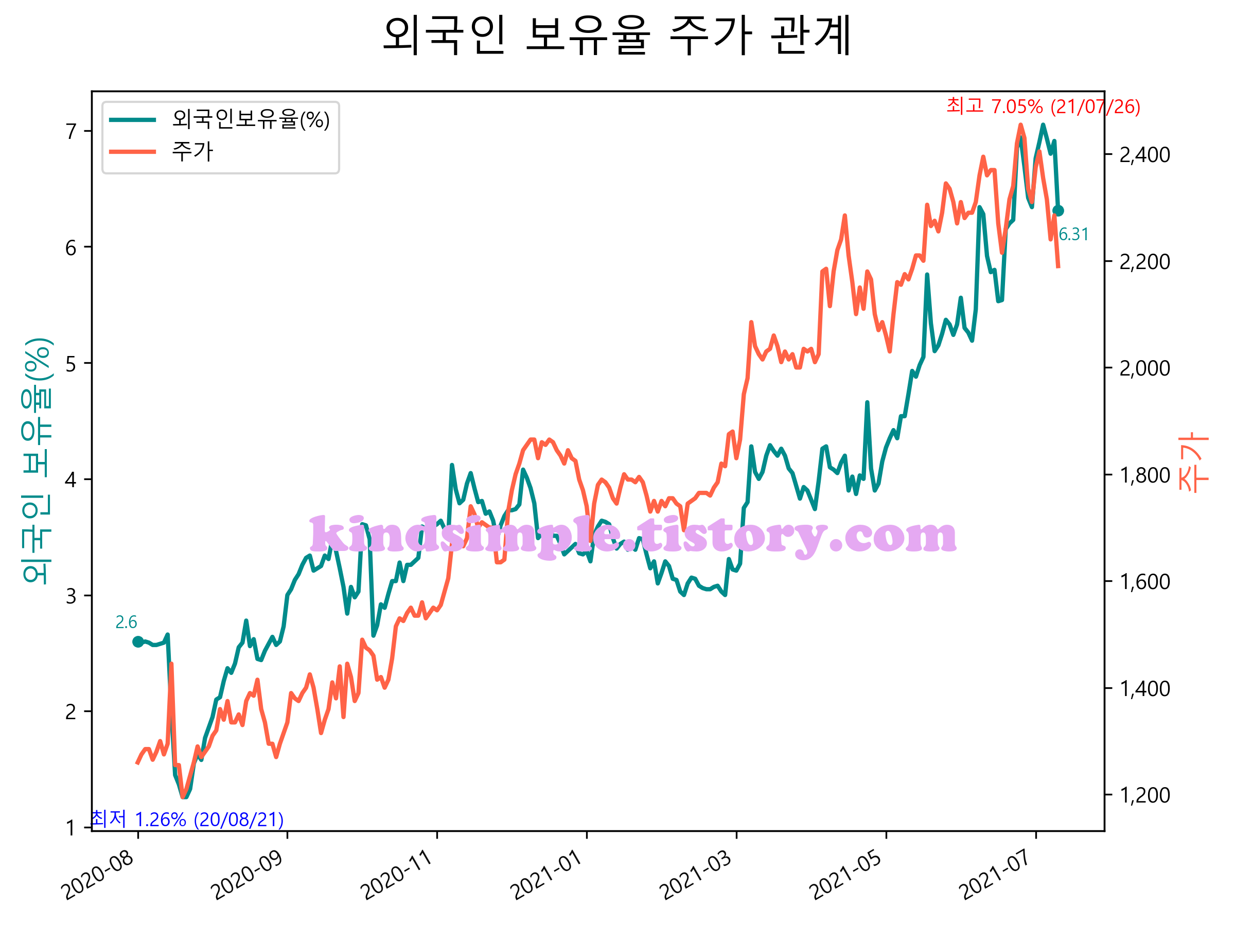 최근 1년간 외국인 보유율 및 주가와의 관계입니다.