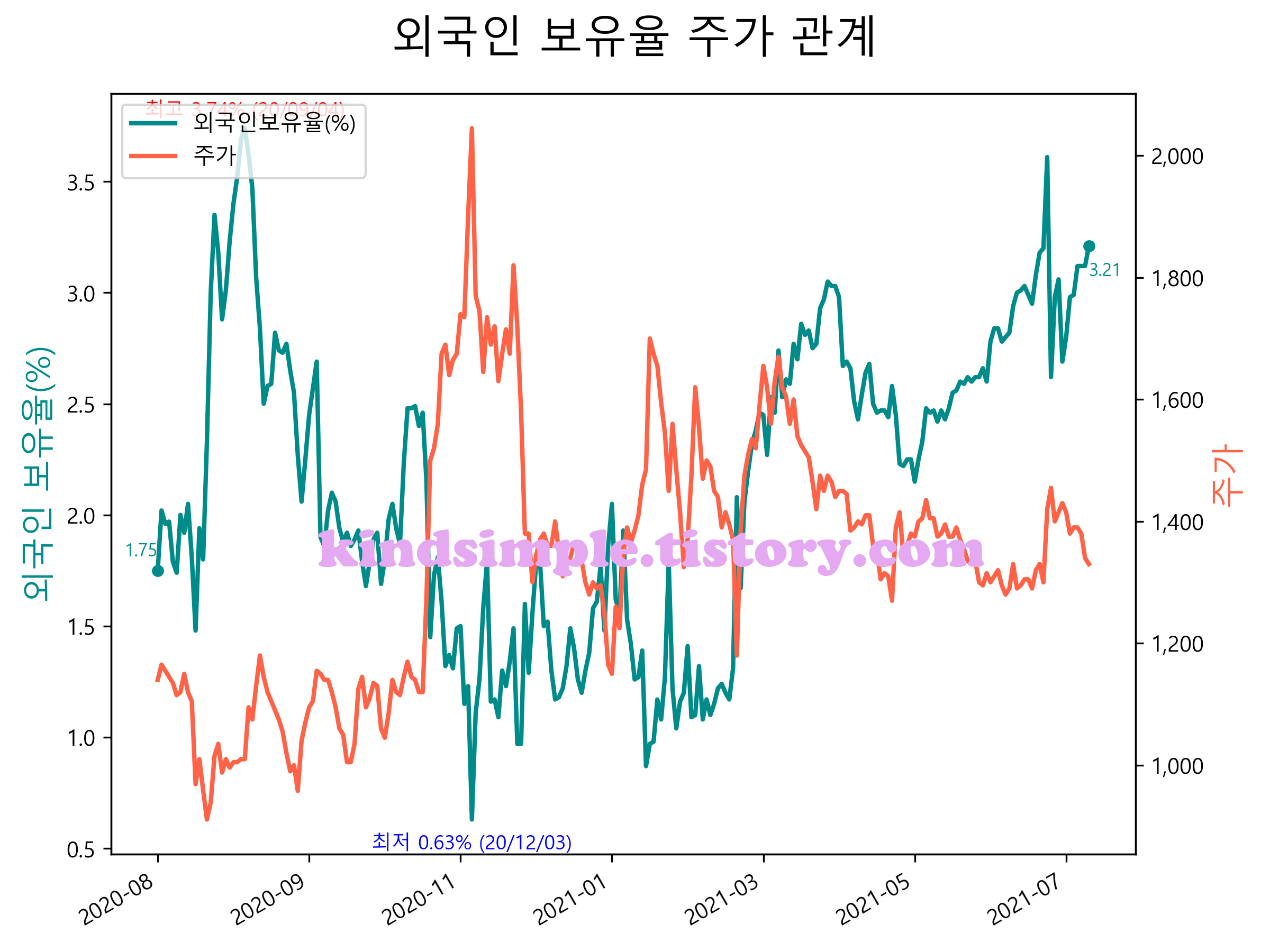 최근 1년간 외국인 보유율 및 주가와의 관계입니다.