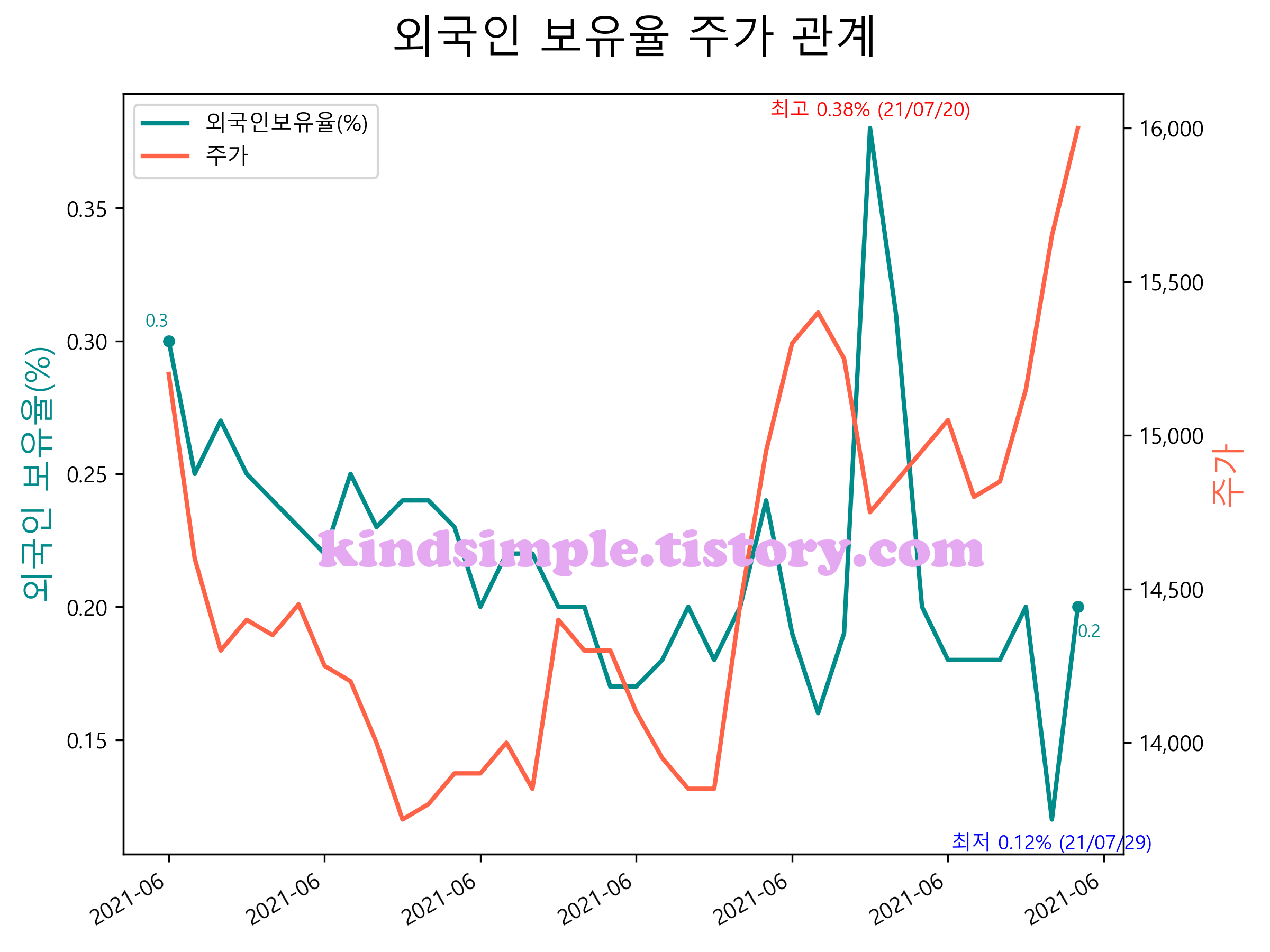 최근 1년간 외국인 보유율 및 주가와의 관계입니다.