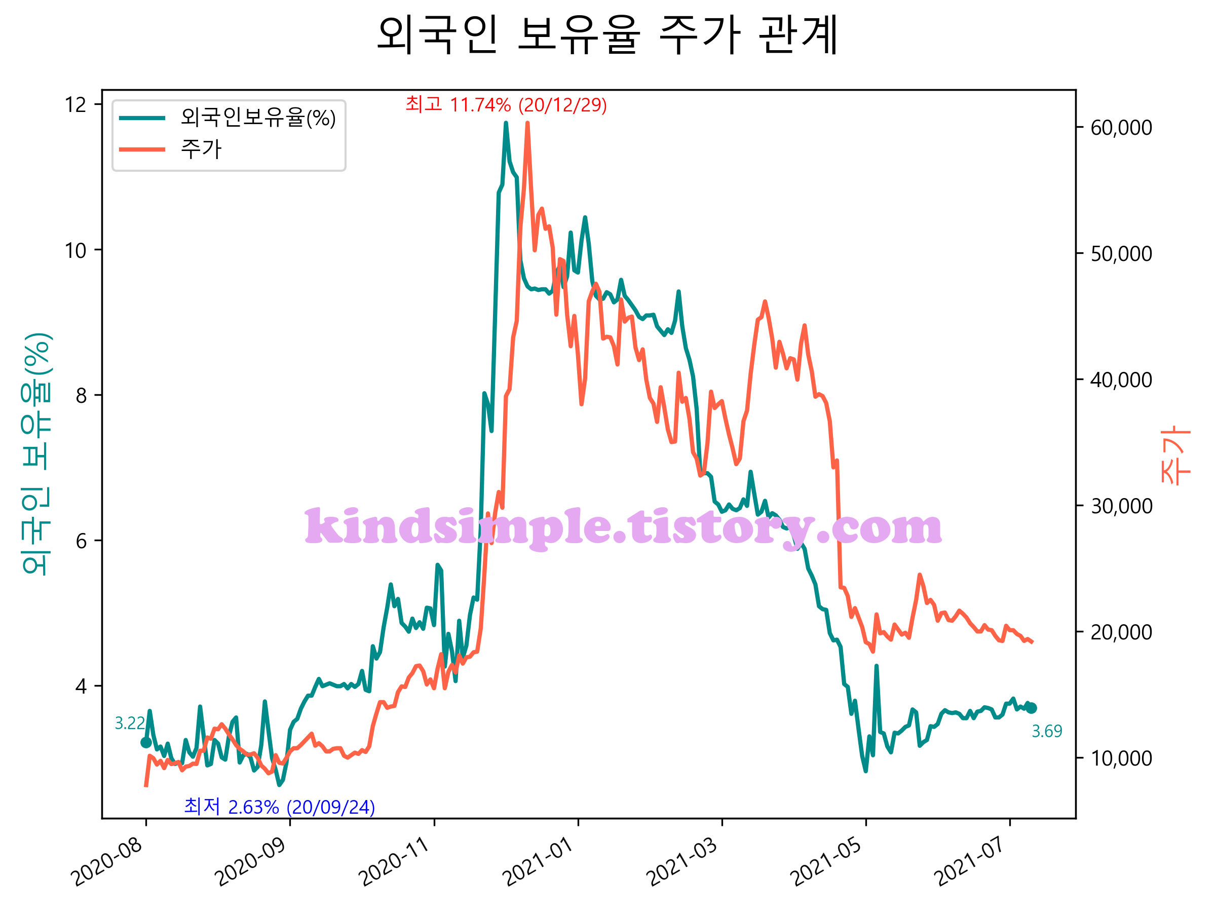 최근 1년간 외국인 보유율 및 주가와의 관계입니다.
