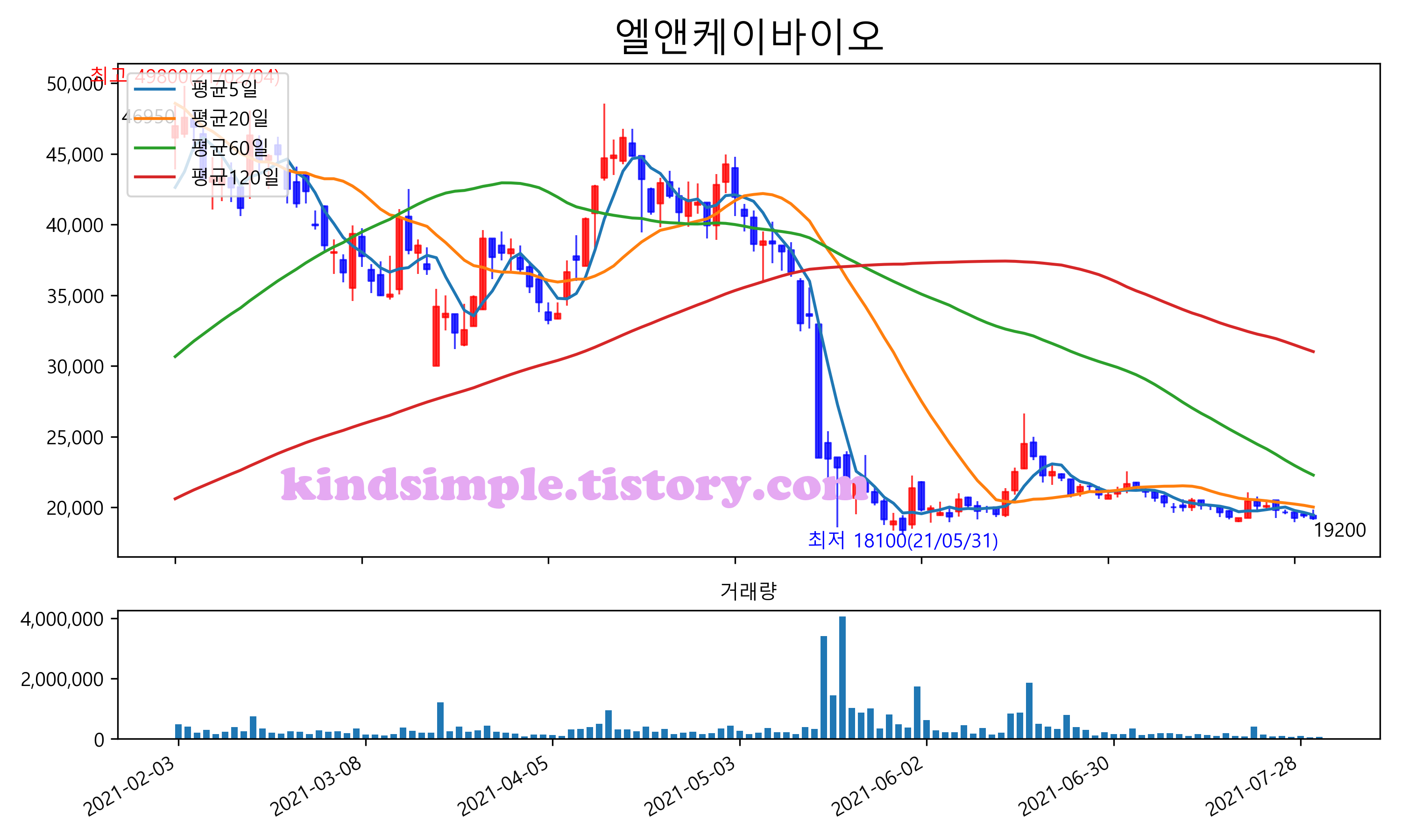 최근 6개월간 캔들차트 및 이동평균선입니다.