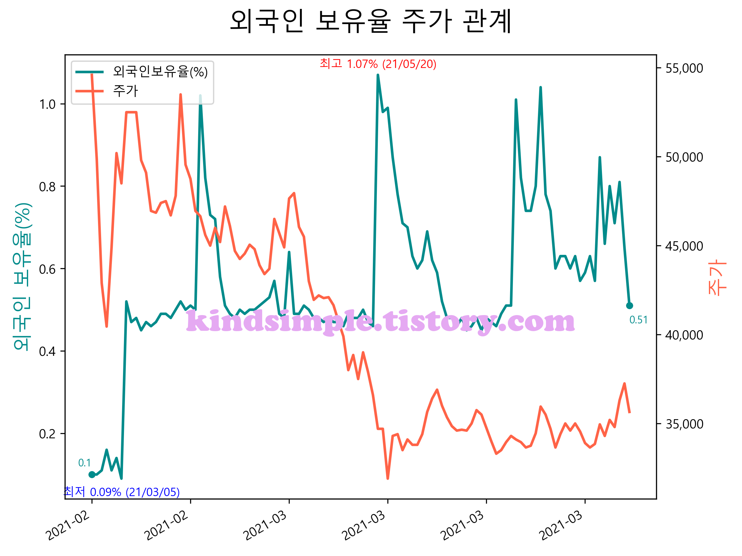 최근 1년간 외국인 보유율 및 주가와의 관계입니다.
