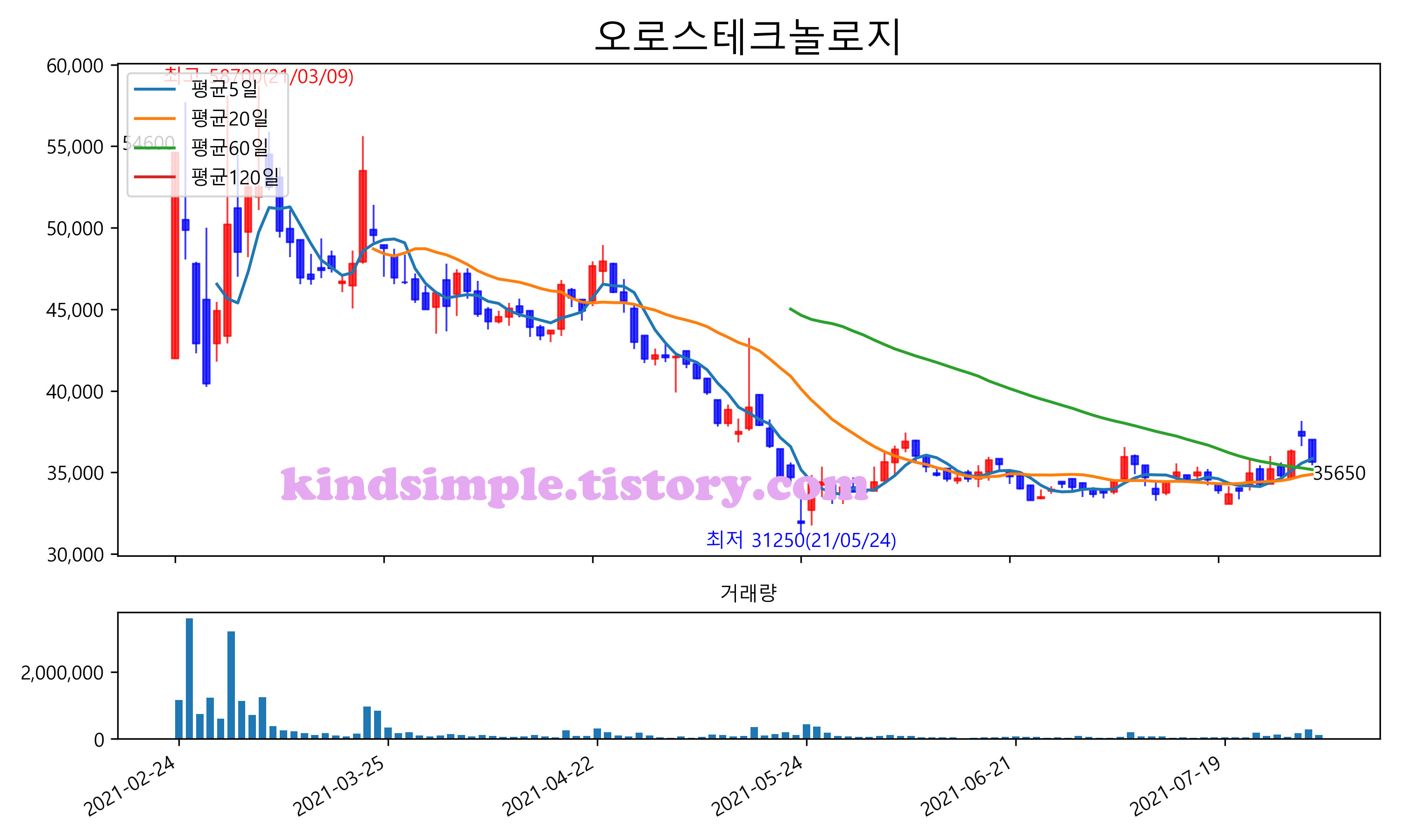 최근 6개월간 캔들차트 및 이동평균선입니다.