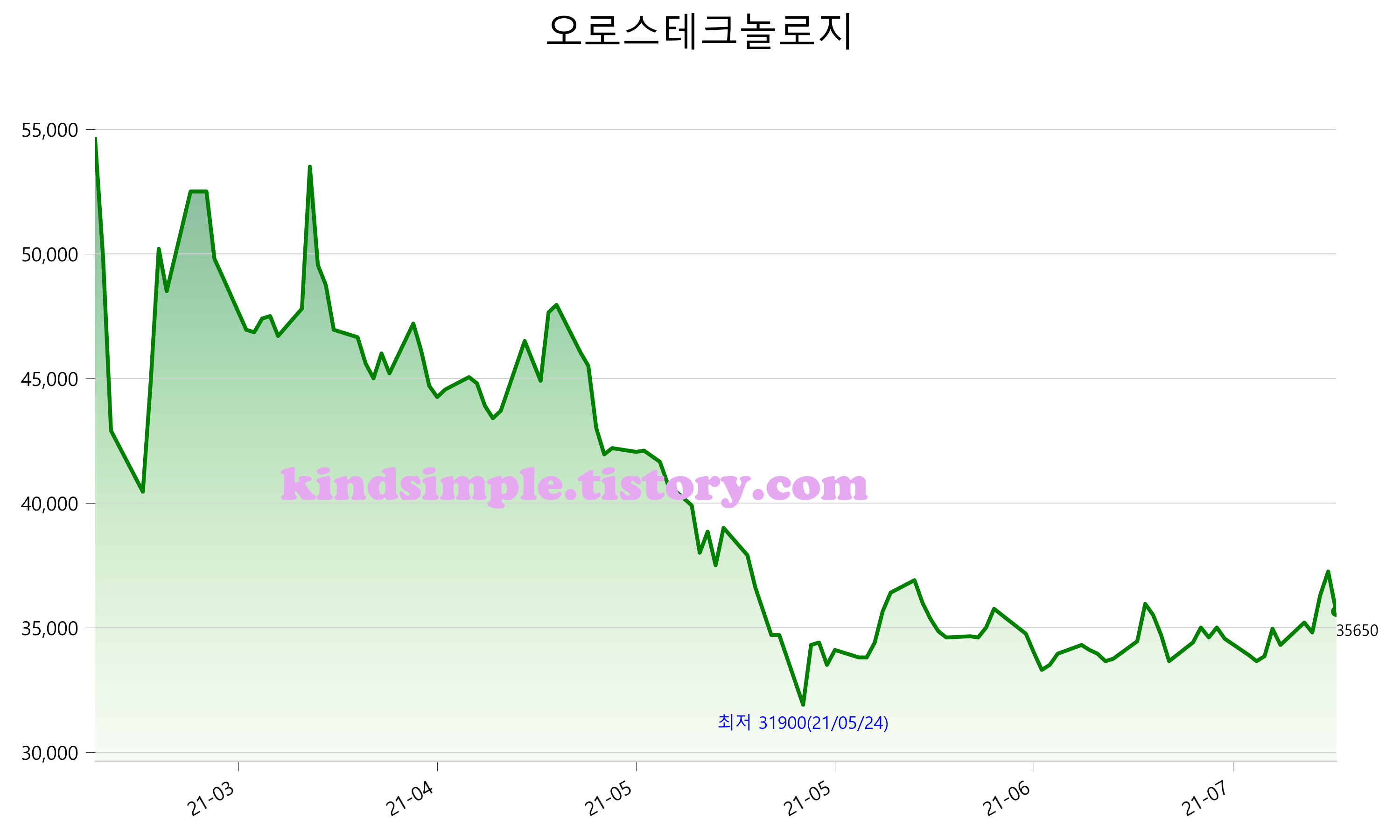 52주 최고가는 54,600원(2021-02-24), 52주 최저가는 31,900원(2021-05-24)으로 52주간 변동률은 -34.7% 입니다.