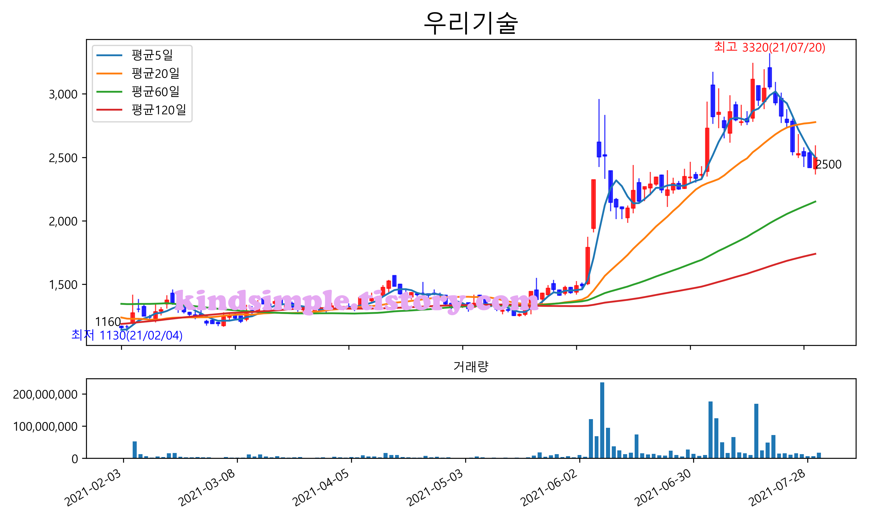 최근 6개월간 캔들차트 및 이동평균선입니다.