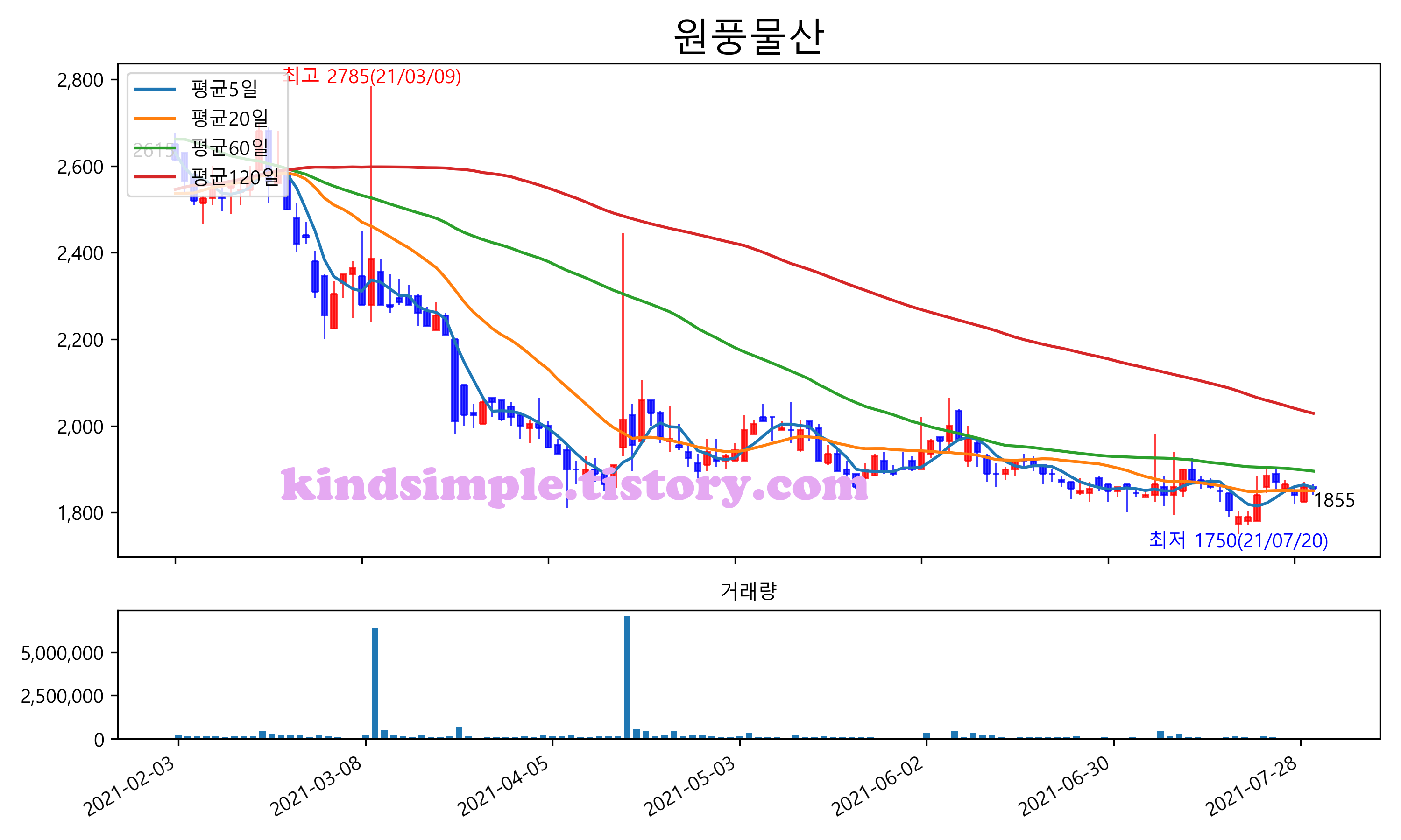 최근 6개월간 캔들차트 및 이동평균선입니다.