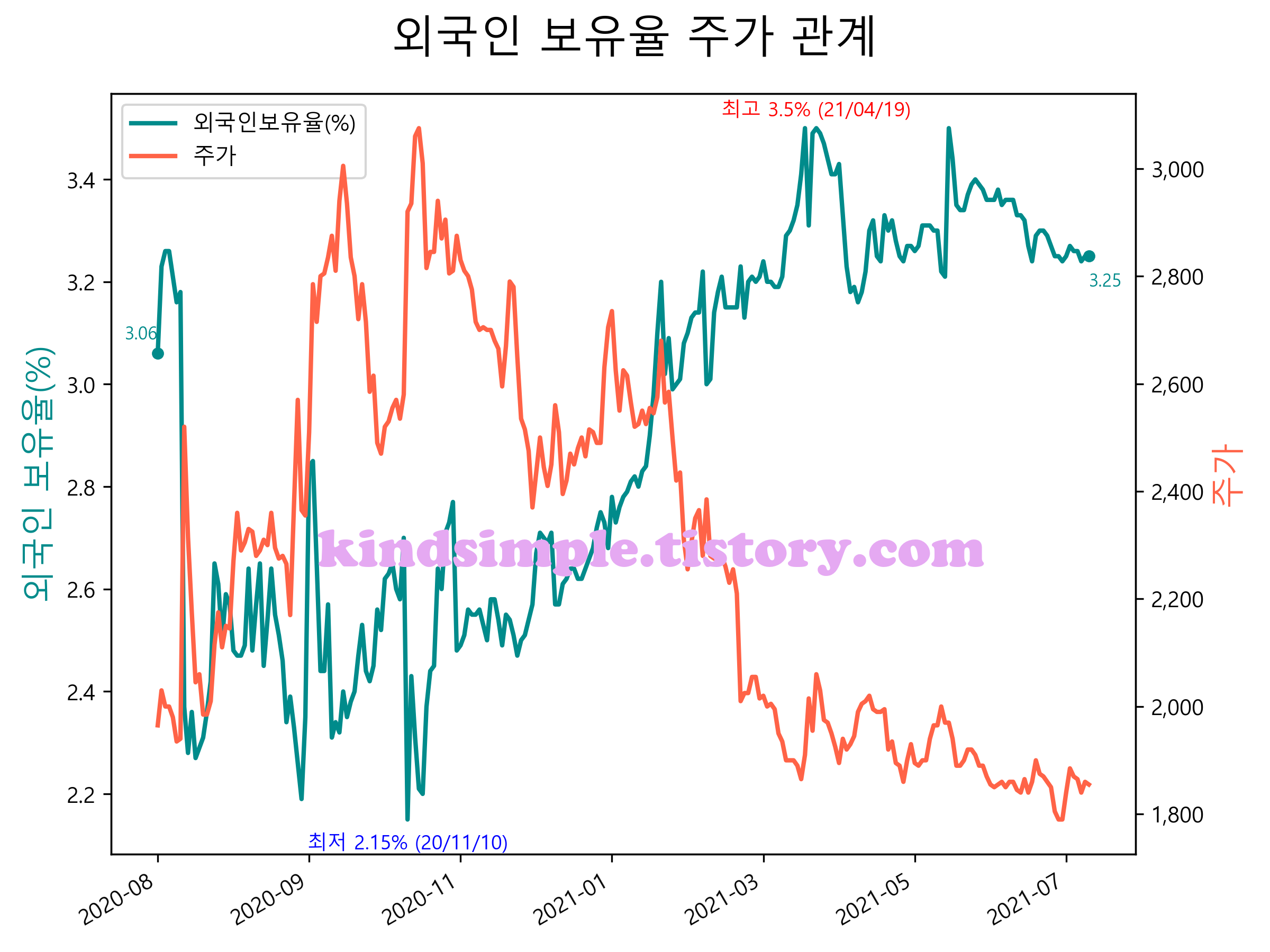 최근 1년간 외국인 보유율 및 주가와의 관계입니다.