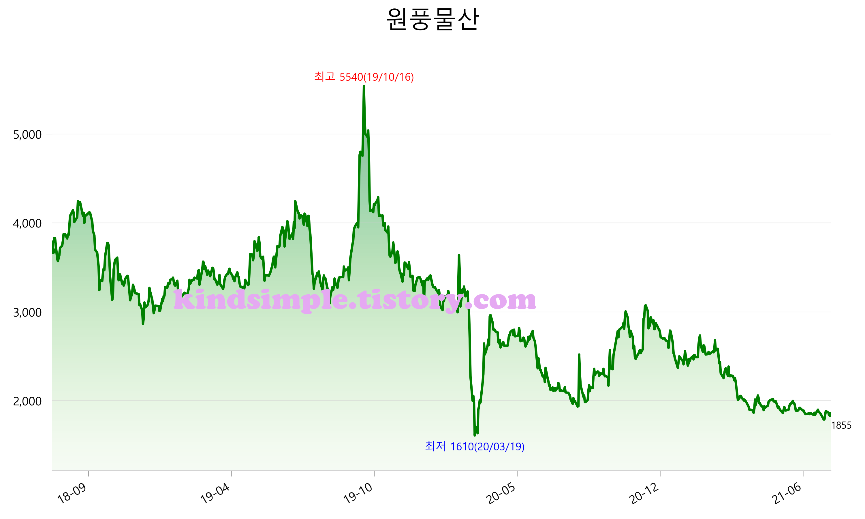 8월 2일 기준 주가는 1,855원 입니다. 아래는 최근 3년간의 주가흐름입니다.