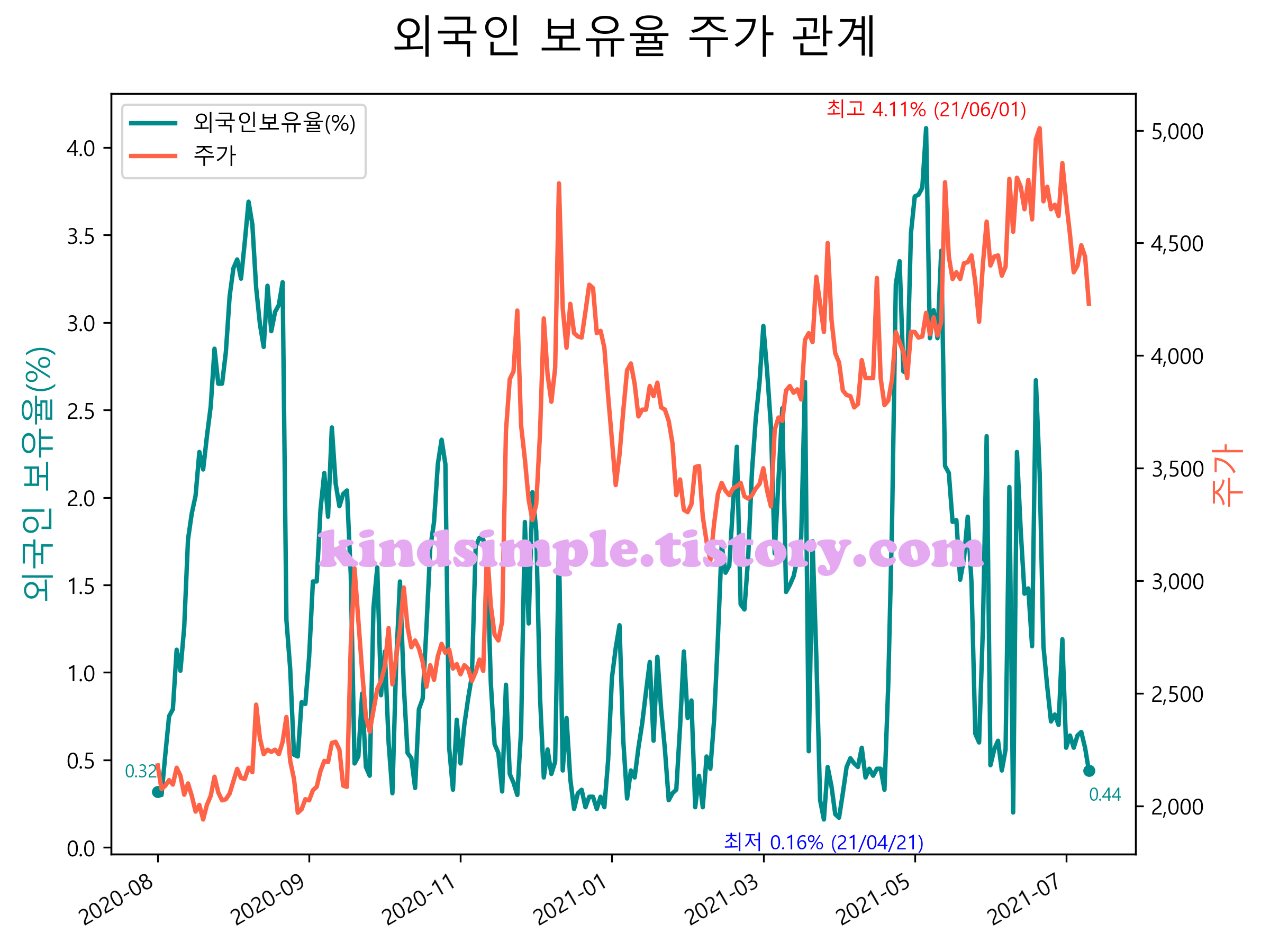 최근 1년간 외국인 보유율 및 주가와의 관계입니다.