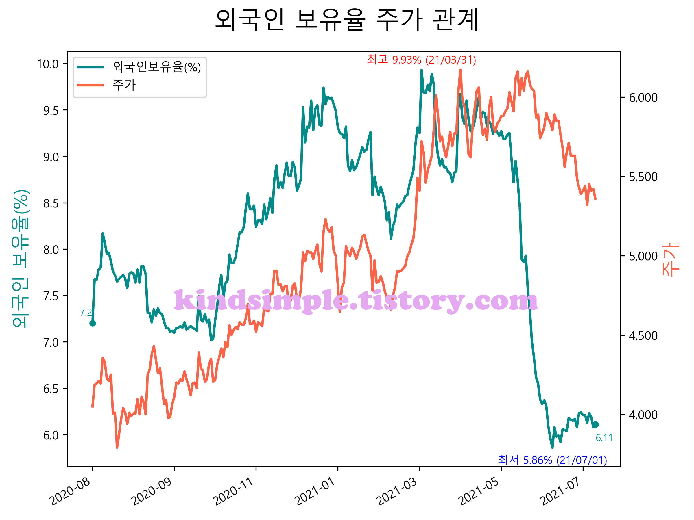 최근 1년간 외국인 보유율 및 주가와의 관계입니다.