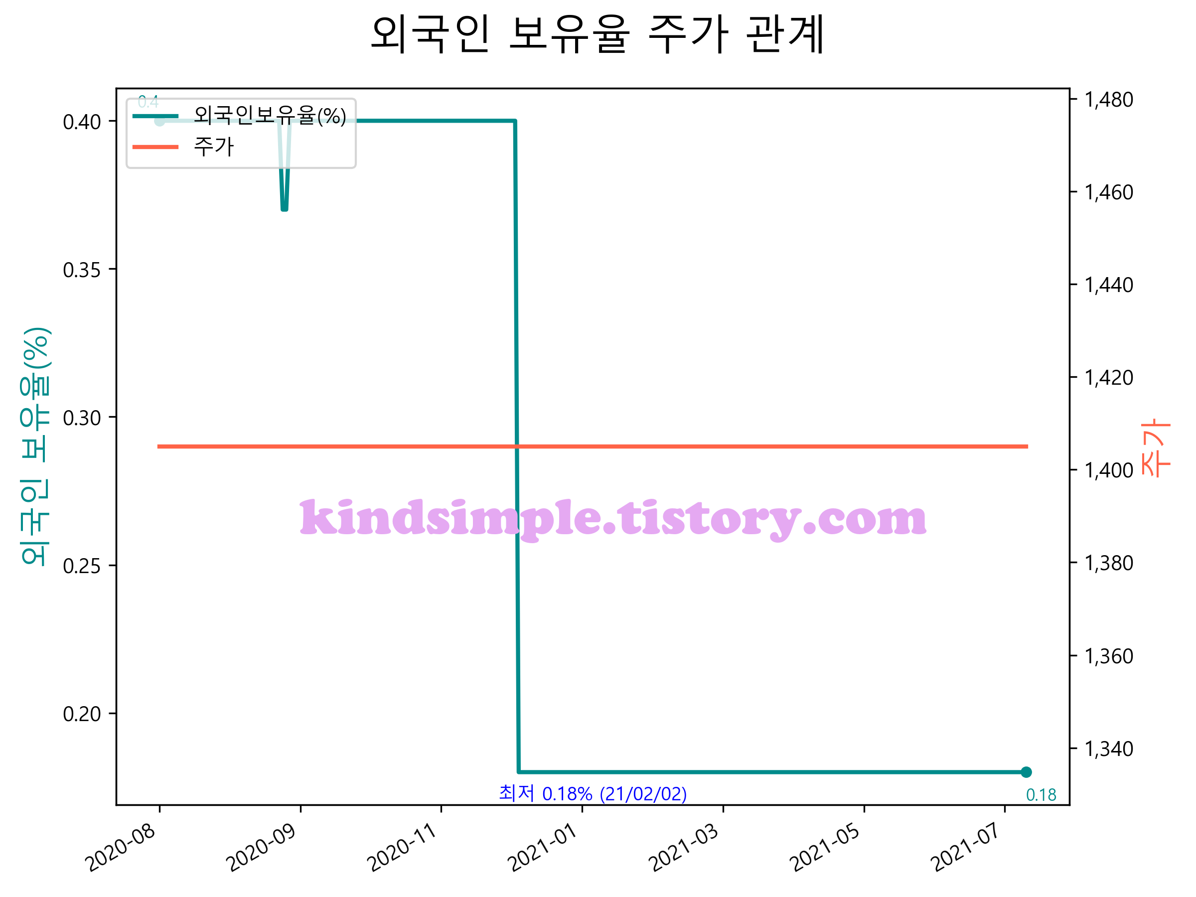 최근 1년간 외국인 보유율 및 주가와의 관계입니다.