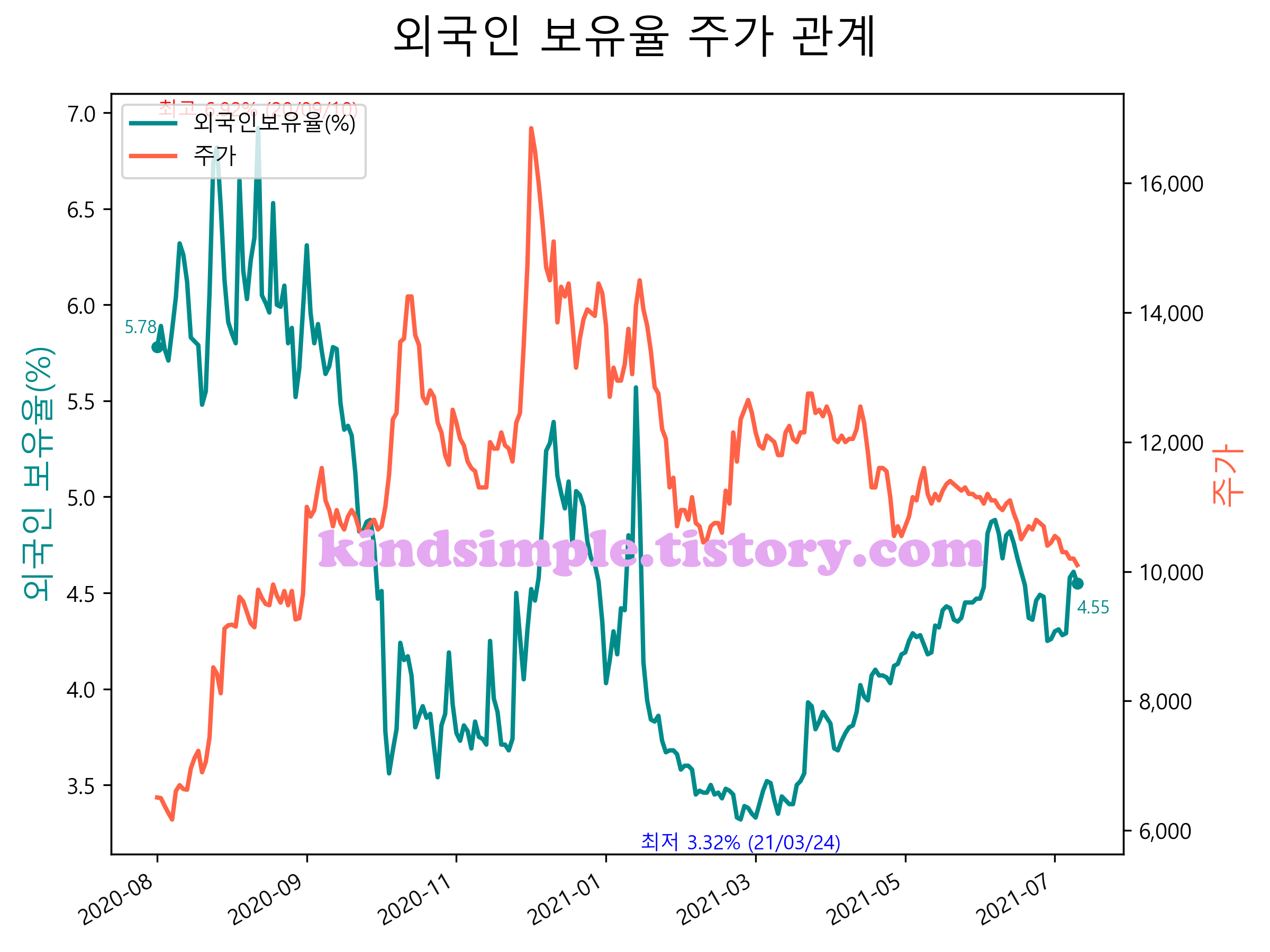 최근 1년간 외국인 보유율 및 주가와의 관계입니다.