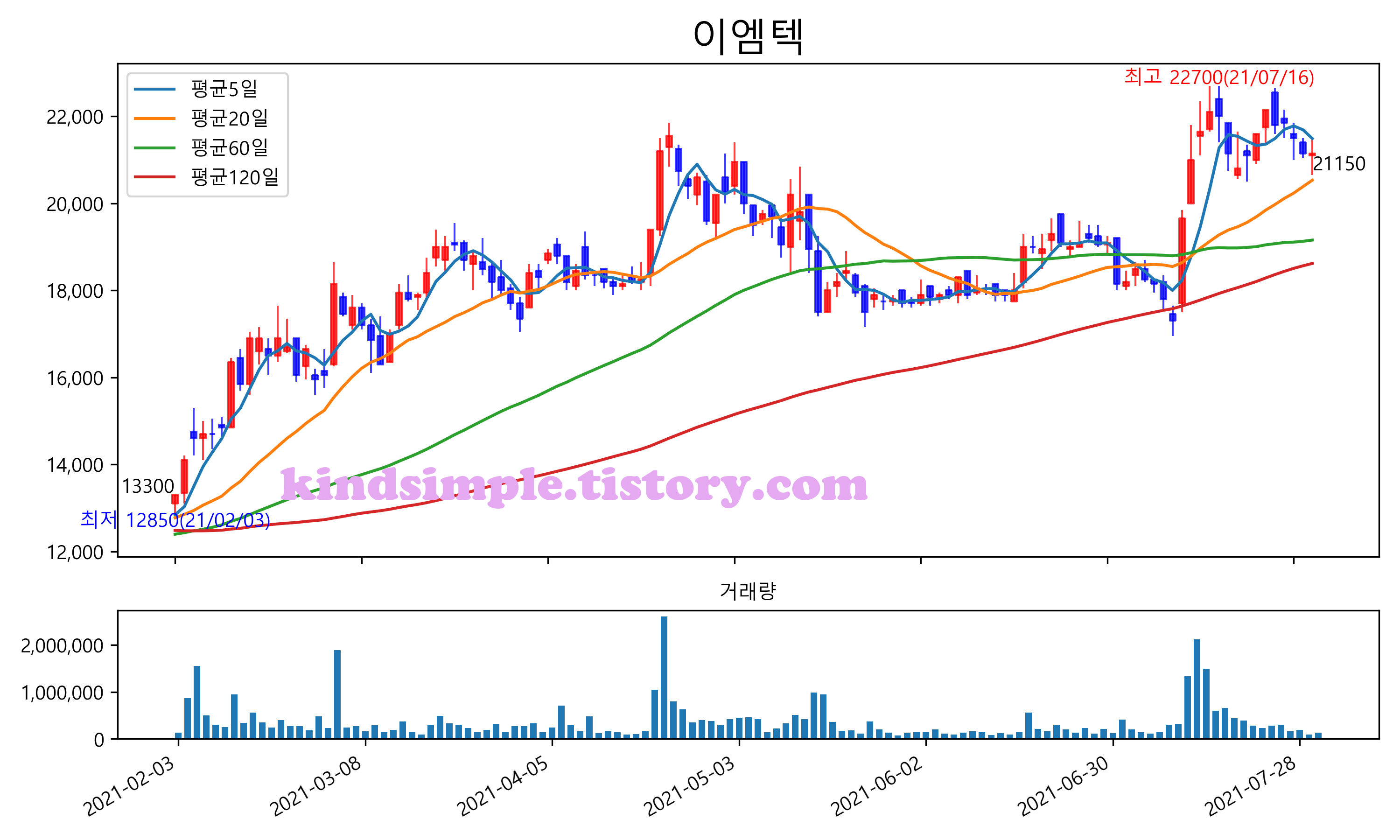 최근 6개월간 캔들차트 및 이동평균선입니다.