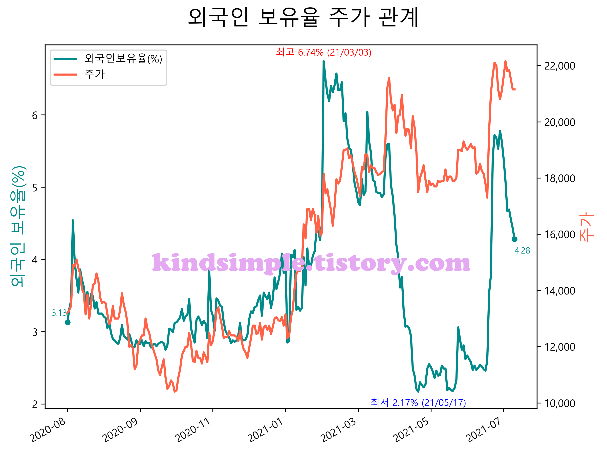 최근 1년간 외국인 보유율 및 주가와의 관계입니다.