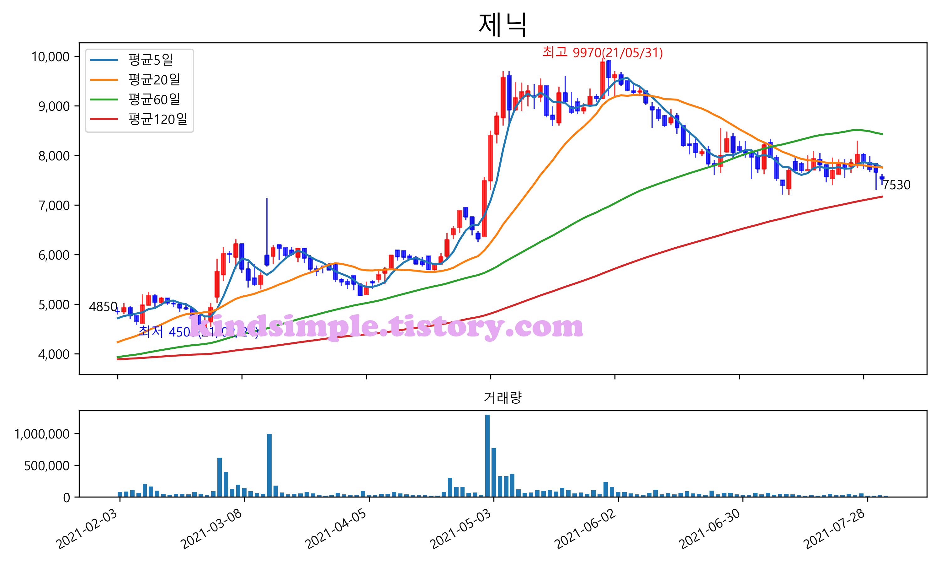 최근 6개월간 캔들차트 및 이동평균선입니다.