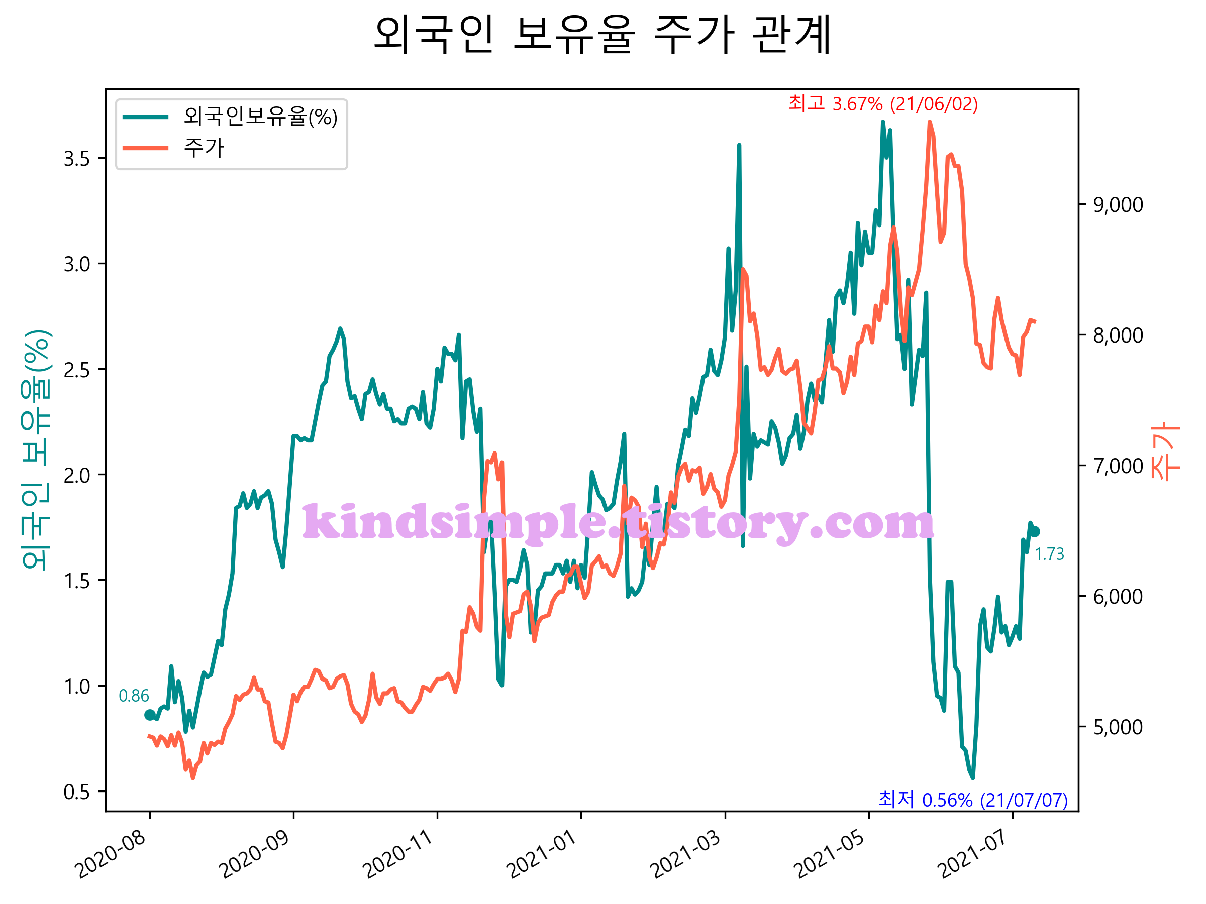 최근 1년간 외국인 보유율 및 주가와의 관계입니다.