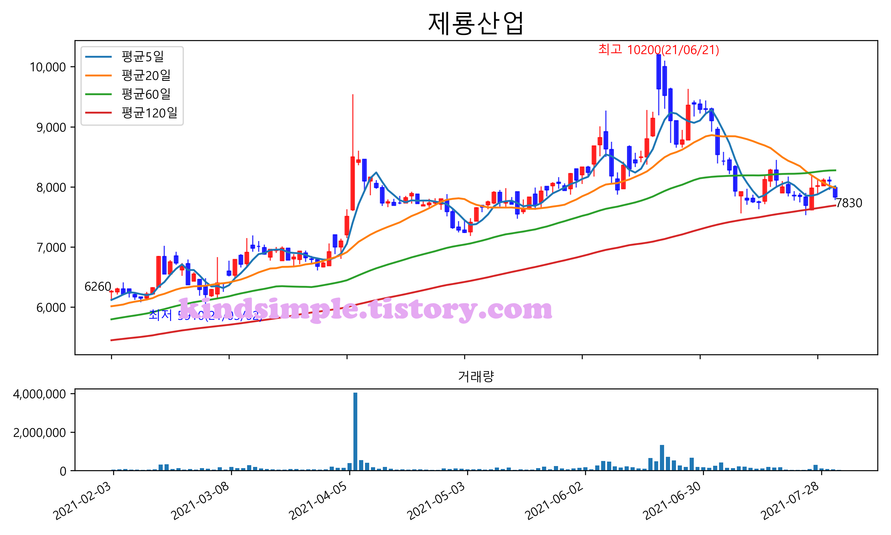 최근 6개월간 캔들차트 및 이동평균선입니다.