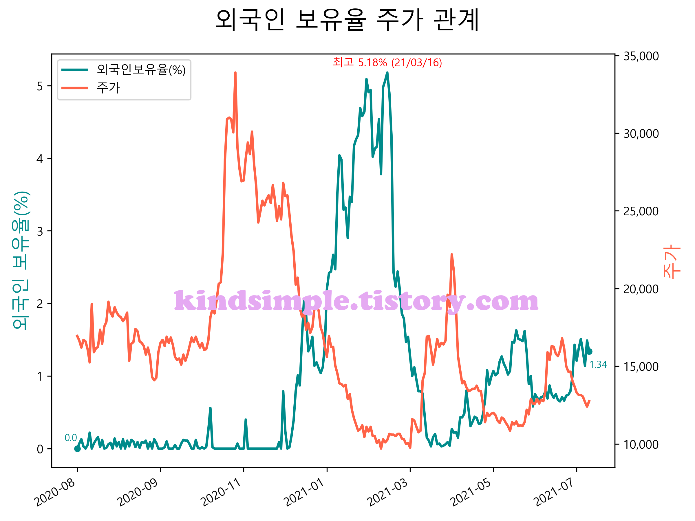 최근 1년간 외국인 보유율 및 주가와의 관계입니다.