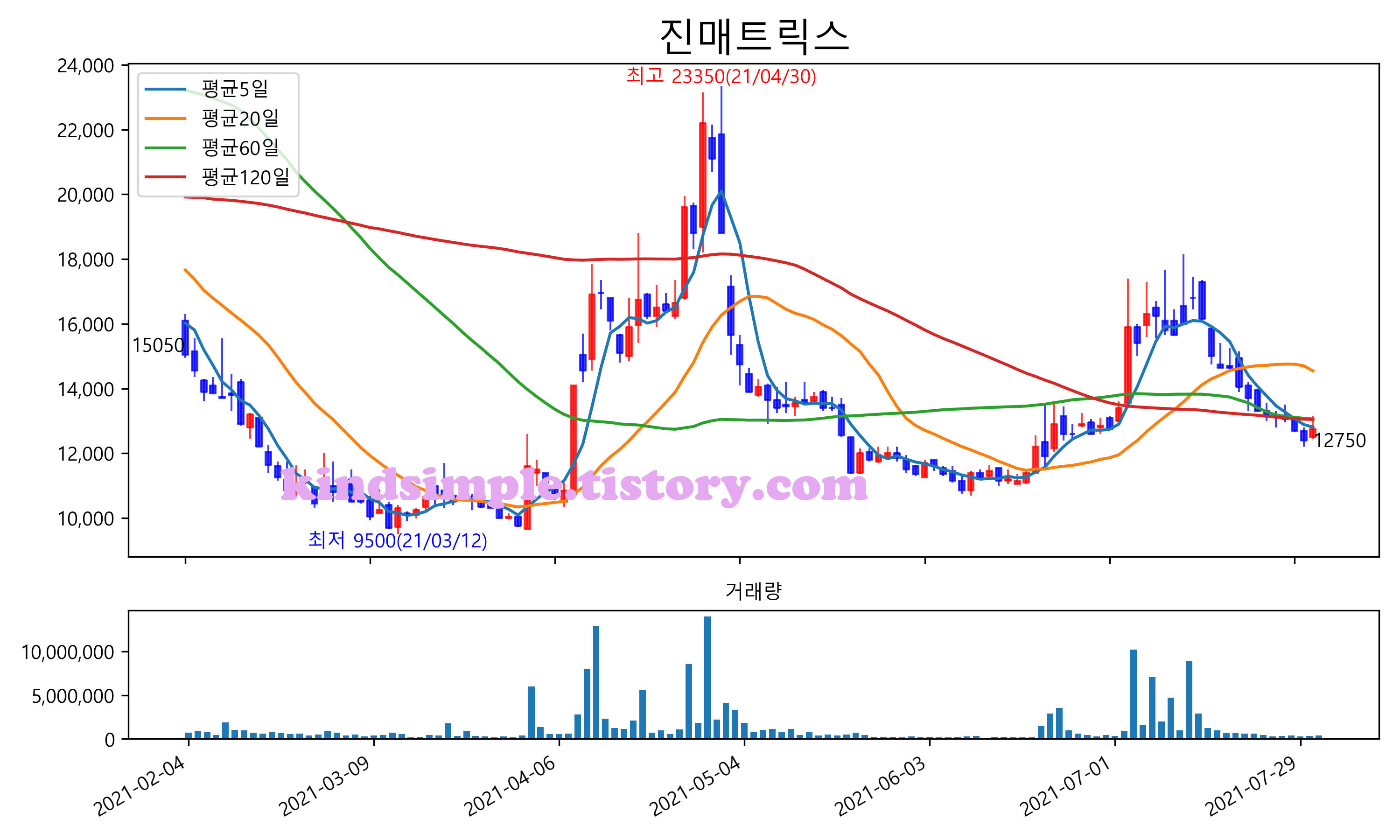최근 6개월간 캔들차트 및 이동평균선입니다.