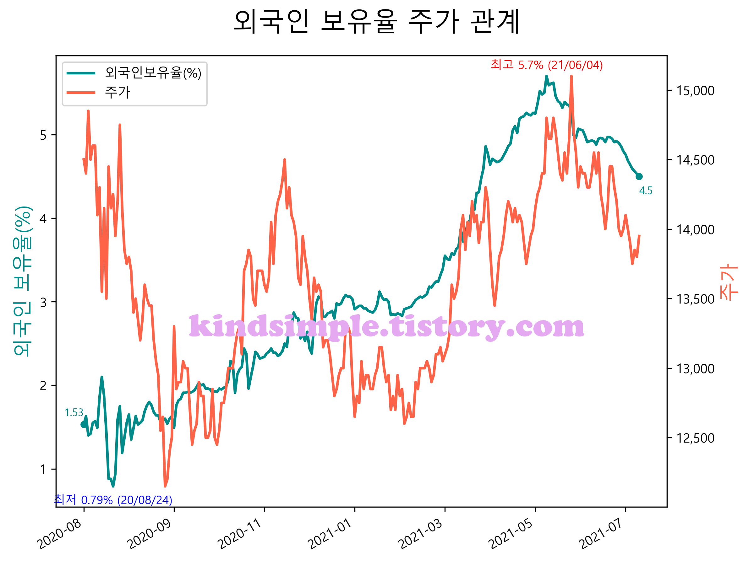 최근 1년간 외국인 보유율 및 주가와의 관계입니다.