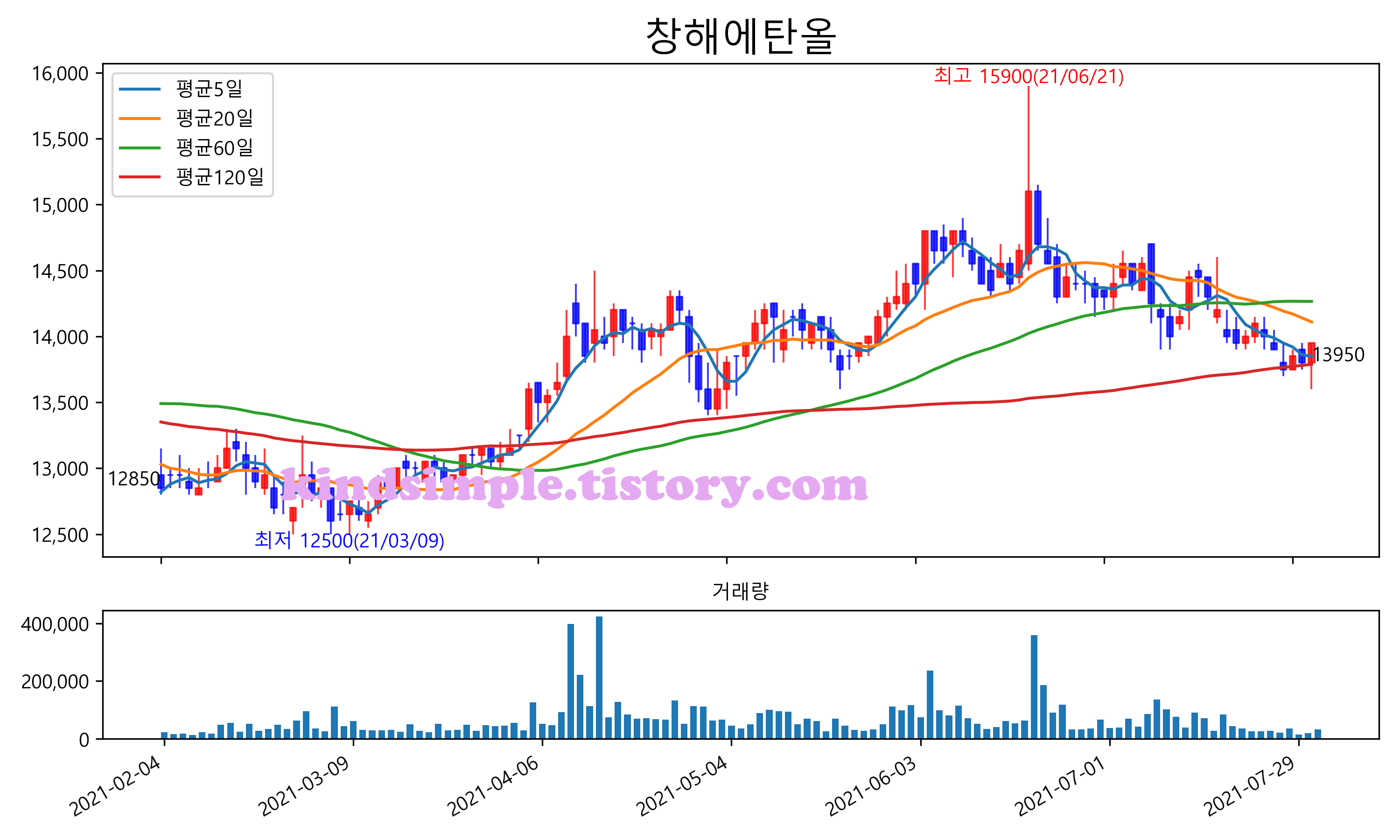 최근 6개월간 캔들차트 및 이동평균선입니다.