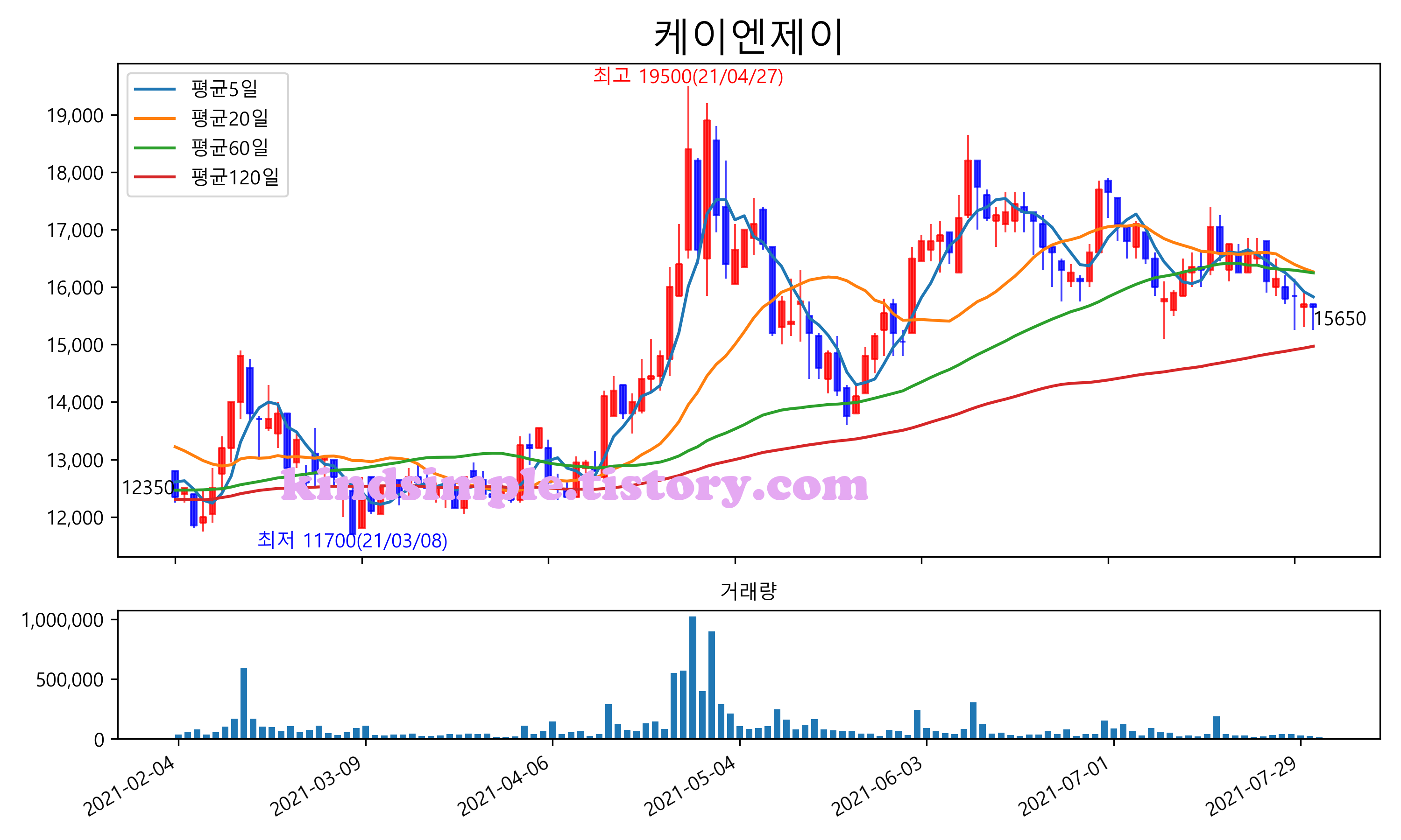 최근 6개월간 캔들차트 및 이동평균선입니다.
