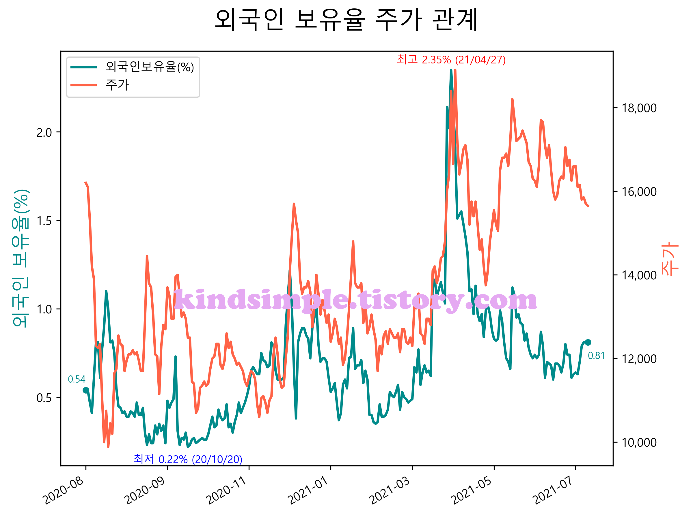 최근 1년간 외국인 보유율 및 주가와의 관계입니다.