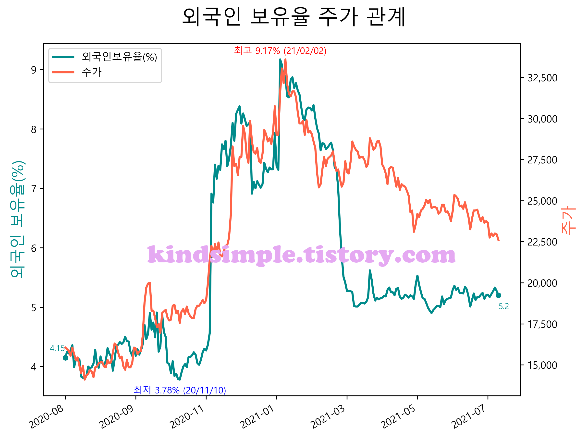 최근 1년간 외국인 보유율 및 주가와의 관계입니다.