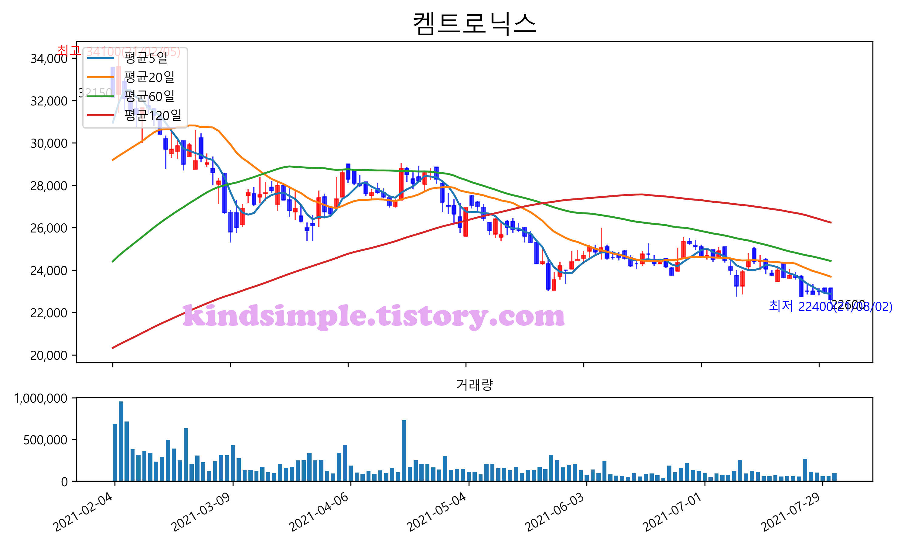 최근 6개월간 캔들차트 및 이동평균선입니다.